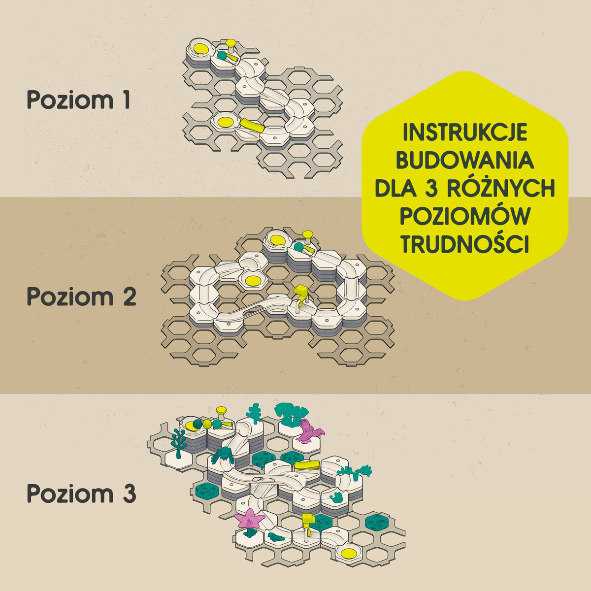W zestawie znajduje się 100 różnorodnych elementów, z których możesz budować bez końca! Wśród nich płytki podstawy, tory, zakręty, płyty wysokości, elementy dekoracyjne, zwierzątka i kulki, a do tego wszystkiego młotek i huśtawka, które sprawią, że kulka poleci jeszcze dalej i jeszcze szybciej!