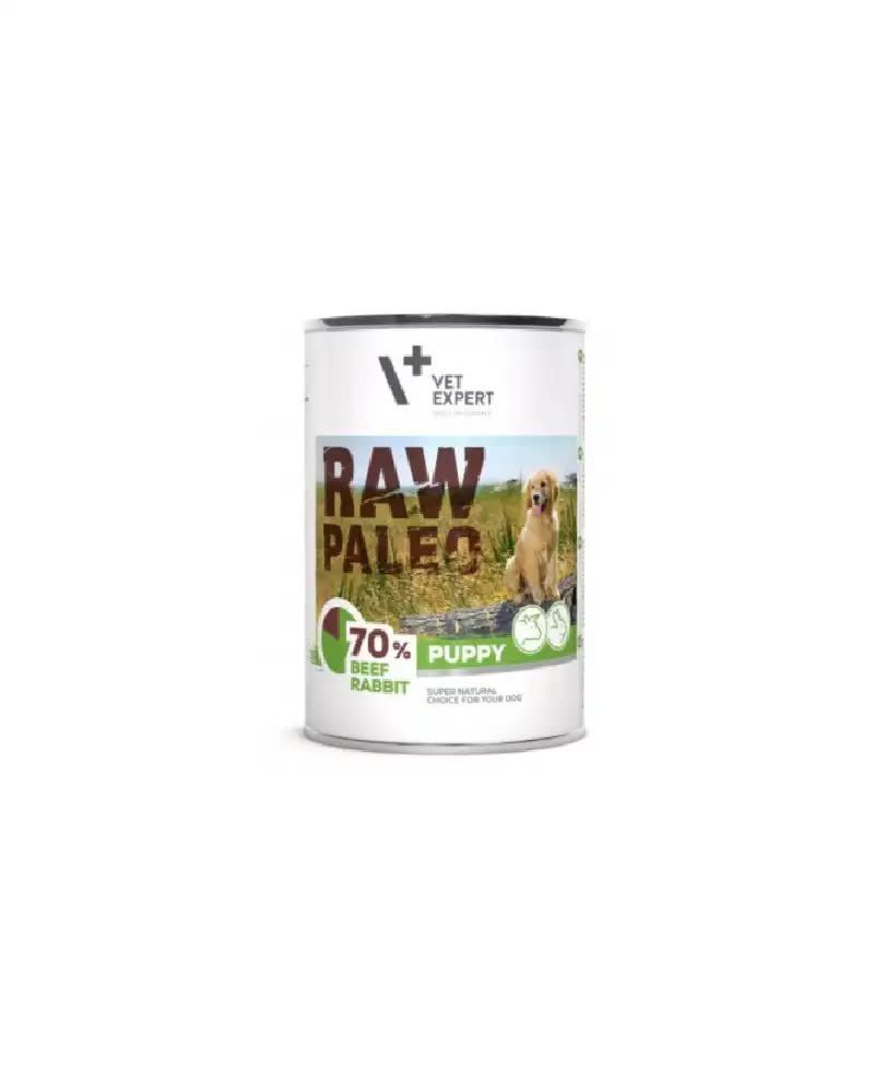 Raw Paleo Puppy Beef and Rabbit jest kompletną i zbilansowaną pełnoporcjową karmą bytową przeznaczoną dla psów rosnących od okresu odsadzenia do osiągnięcia pełnej dojrzałości (ok. 1 roku życia). Produkt spełnia także wymogi suk ciężarnych i karmiących. Karma nie zawiera zbóż. Podstawowym źródłem białka jest wołowina wzbogacona o 15% dodatku królika. Takie połączenie zwiększa smakowitość i zawartość tłuszczu w karmie