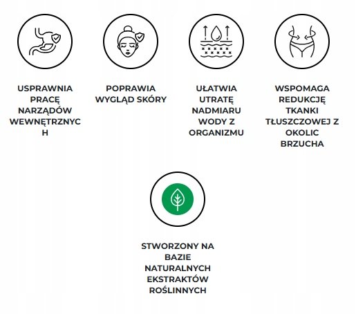 Suplement diety stworzony na bazie naturalnych ekstraktów roślinnych wspomagający procesy usuwania z organizmu ubocznych produktów przemiany materii.