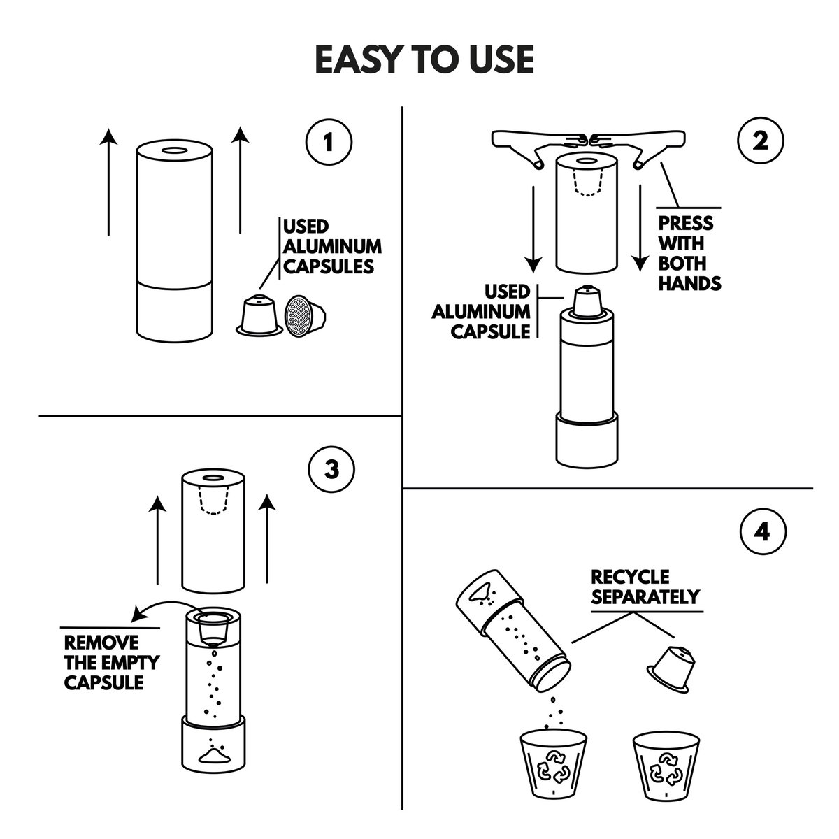 KOMPATYBILNY Z NESPRESSO: Recicloo to narzędzie do recyklingu kapsułek, które może pomóc w recyklingu zużytych kapsułek z kawą kompatybilnych z Nespresso. Współpracuje ze wszystkimi aluminiowymi saszetkami kompatybilnymi z Nespresso i oddziela fusy od aluminiowej kapsułki, dzięki czemu aluminium można poddać recyklingowi i wykorzystać na kompost lub wyrzucić do kosza na odpady spożywcze. Nie nadaje się do kapsułek kompatybilnych z tworzywami sztucznymi