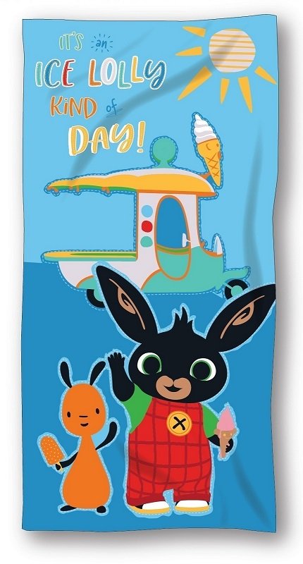 Wakacyjny ręcznik kąpielowy z królikiem Bing i jego przyjacielem, skutecznie ochroni mokrą skórę dziecka przed wiatrem i słońcem.