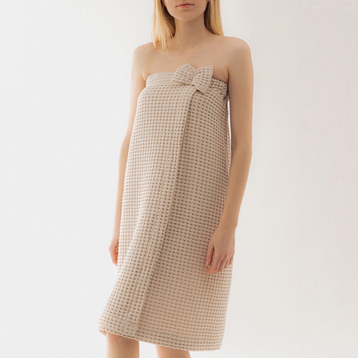 Ręcznik kąpielowy VAFFEL znakomicie sprawdzi się podczas wyjścia na basen, do parku wodnego czy w trakcie pobytu w spa. Solidny rzep sprawia, że ręcznik nie ześlizguje się z ciała, dzięki czemu noszenie go nie wiąże się z żadnymi obawami. Górny pas ręcznika przyozdobiono kokardą, która dodaje mu uroku.