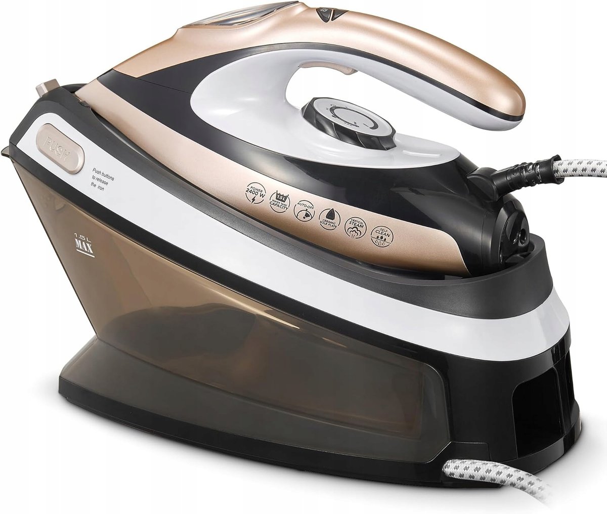 Dzięki dużemu zbiornikowi na wodę o pojemności 1,5 litra możliwe jest prasowanie przez dłuższy czas bez konieczności dolewania wody. Żelazko umożliwia pracę zarówno na sucho, jak i z parą – poziomo oraz pionowo – co sprawia, że idealnie nadaje się do prasowania koszul, firan czy delikatnych materiałów zawieszonych na wieszaku.