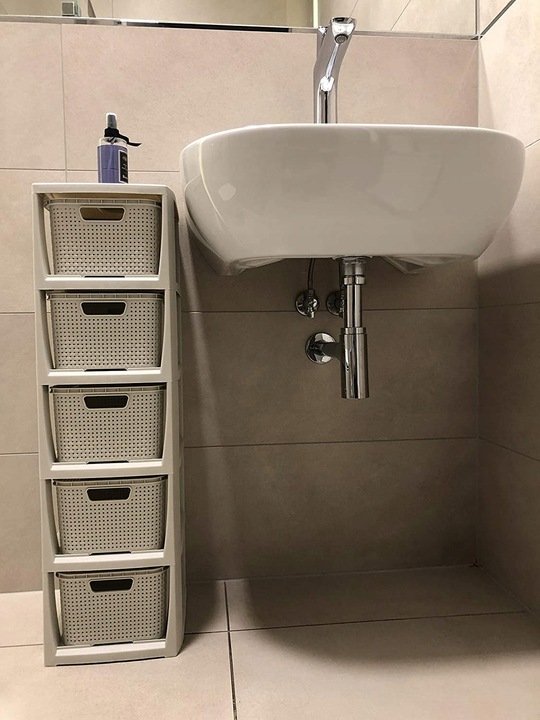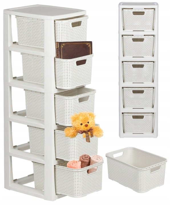 Funkcjonalność na pierwszym miejscu: Wygodne uchwyty na koszach ułatwiają manipulowanie nimi, a aż pięć wyjmowanych koszyków zapewnia dużą przestrzeń do przechowywania różnorodnych przedmiotów. Bez obaw możesz korzystać z naszego regału w każdym pomieszczeniu - od łazienki, przez kuchnię, aż po sypialnię czy przedpokój.