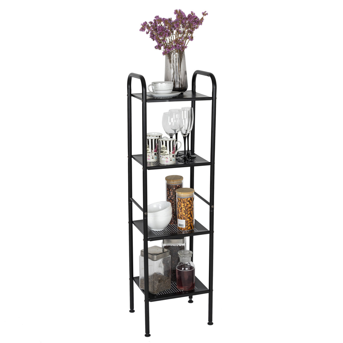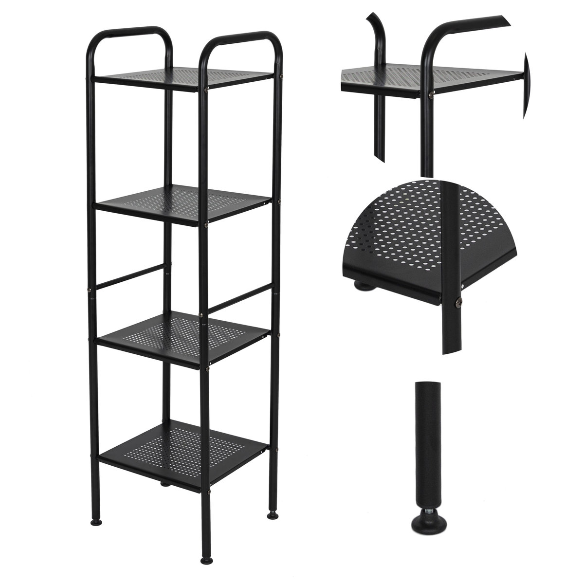 Regał łazienkowy, stojący, w całości wykonany z wysokiej jakości stali malowanej proszkowo na czarno (matowy). Posiada regulowane nóżki oraz cztery obszerne półki rozmieszczonych w równych odstępach.