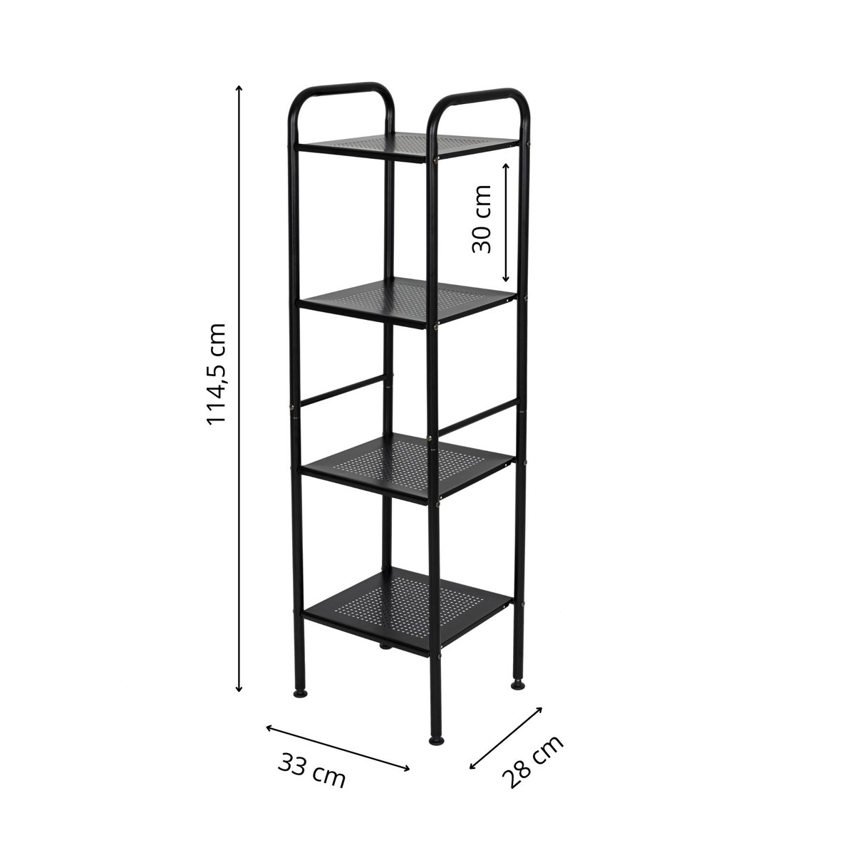 Regał łazienkowy, stojący, w całości wykonany z wysokiej jakości stali malowanej proszkowo na czarno (matowy). Posiada regulowane nóżki oraz cztery obszerne półki rozmieszczonych w równych odstępach. Powierzchnia każdej półki pokryta jest drobnymi dziurkami.