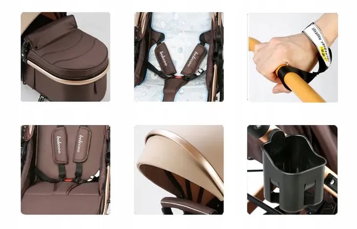 ✔️ Skrętne koła przednie, montaż przód/tył, dodatkowa amortyzacja, regulowane nakrycie, śpiworek, pas bezpieczeństwa, kieszonka na smartfon, hamulec z centralnym zamknięciem.