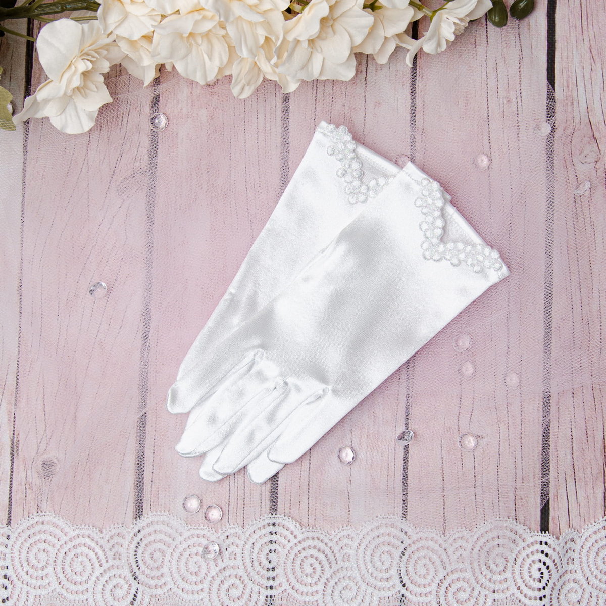 Pełne rękawiczki komunijne dla dziewczynki. Wykonane z białej, elastycznej satyny. Uroku dodaje im brokatowa, kwiatowa aplikacja, która pięknie połyskuje.
