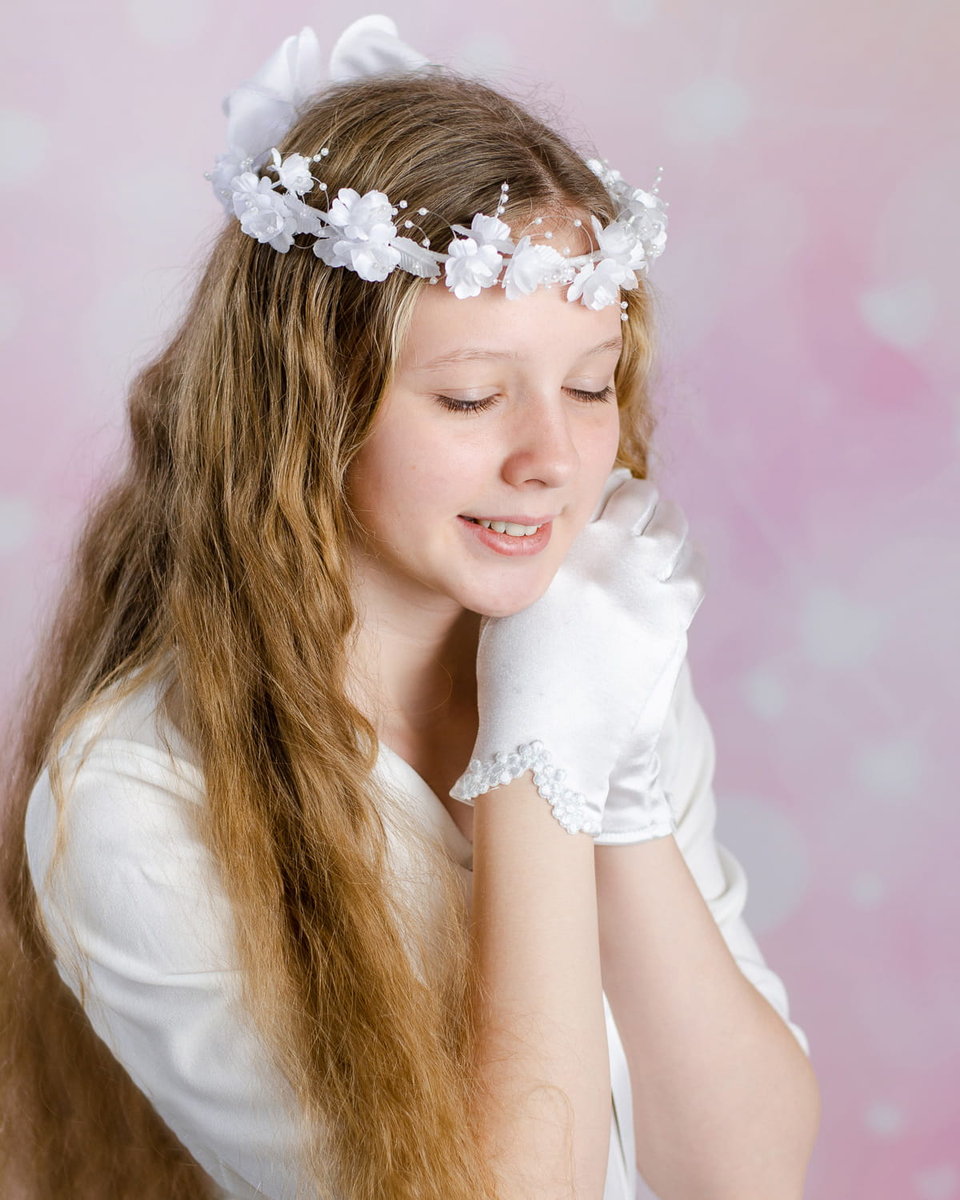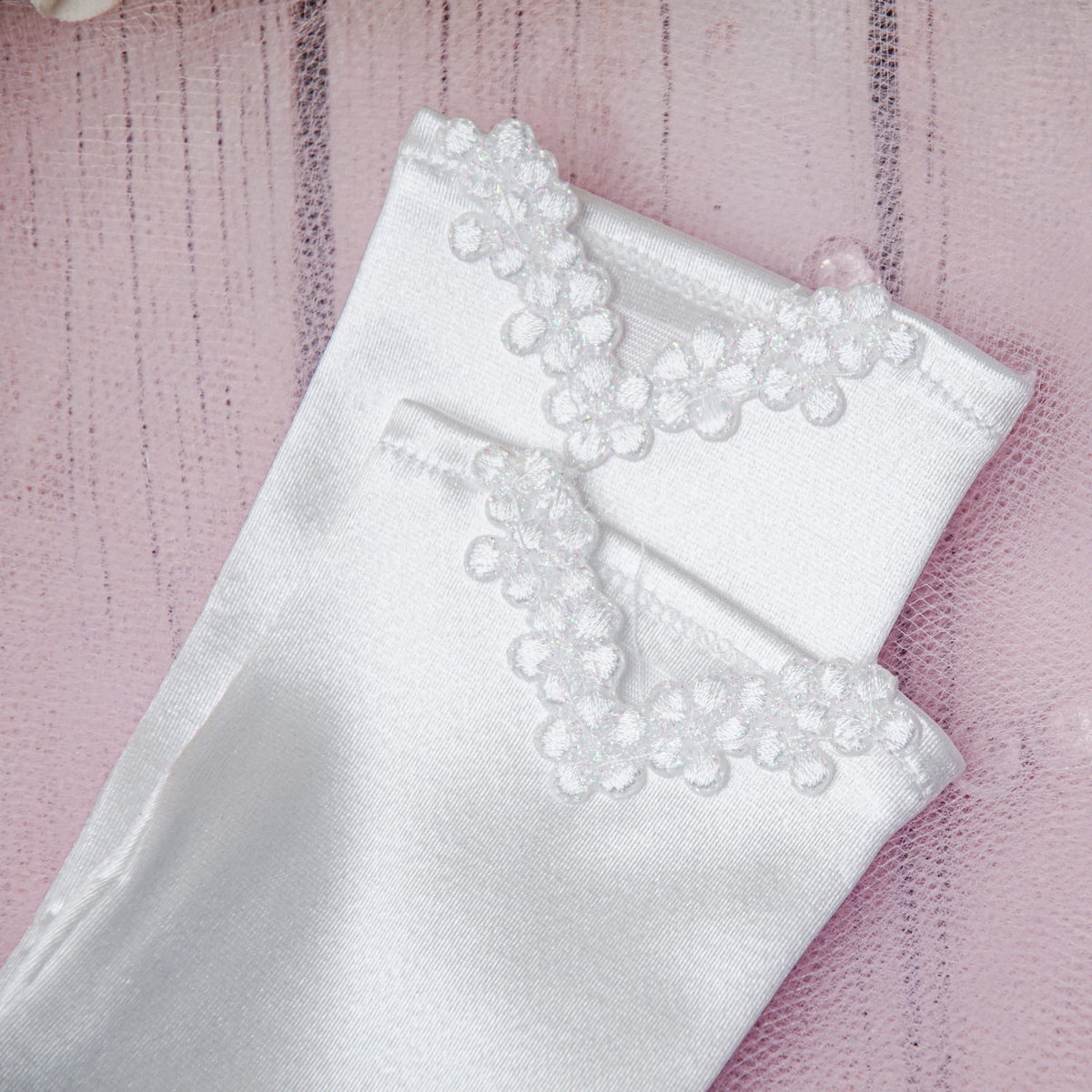 Rękawiczki komunijne pełne z kwiatową aplikacją.