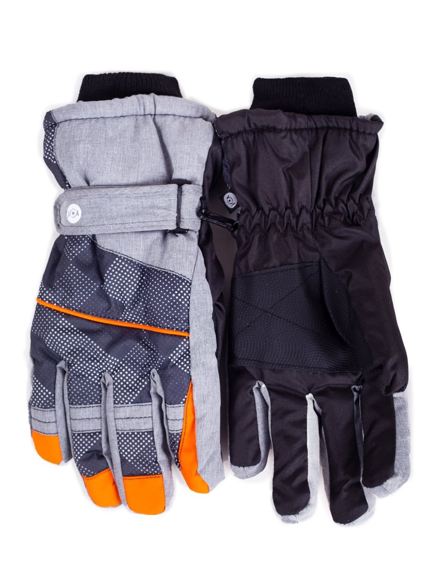Narciarskie rękawiczki męskie w odcieniach szarości z pomarańczowymi wstawkami. Wnętrze rękawiczki wykończone miłym polarem.