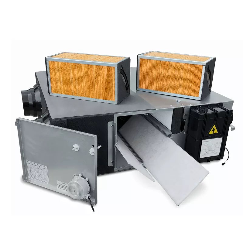 SYSTEM STERUJĄCYOdpowiedzialny jest za kontrolę pracy całego urządzenia. Zmiana ustawień odbywa się za pośrednictwem panelu sterującego, który umożliwia ustawienie trybu pracy, włączenie lub wyłączenie bypassu, ustawienie mocy wentylatorów, podgląd temperatur powietrza zasysanego i wyciągowego.