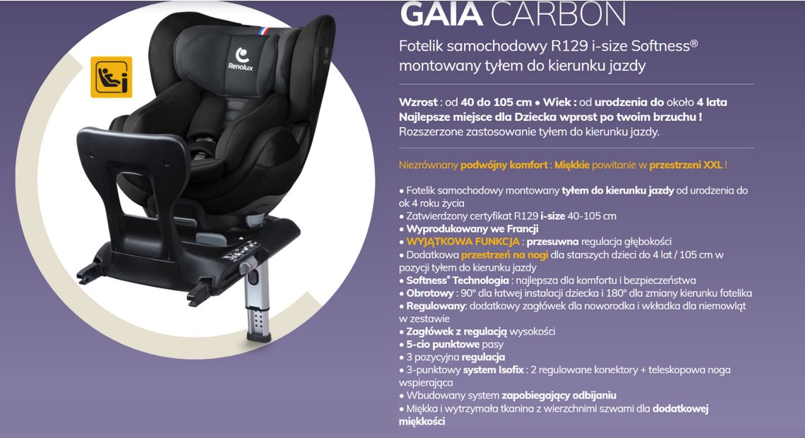 Obrotowy fotelik samochodowy Renolux Gaia i-size w kolorze CarbonFotelik samochodowy montowany tyłem do kierunku jazdy od urodzenia do ok 4 roku życia• Zatwierdzony certyfikat R129 I-size 40-105 cm•