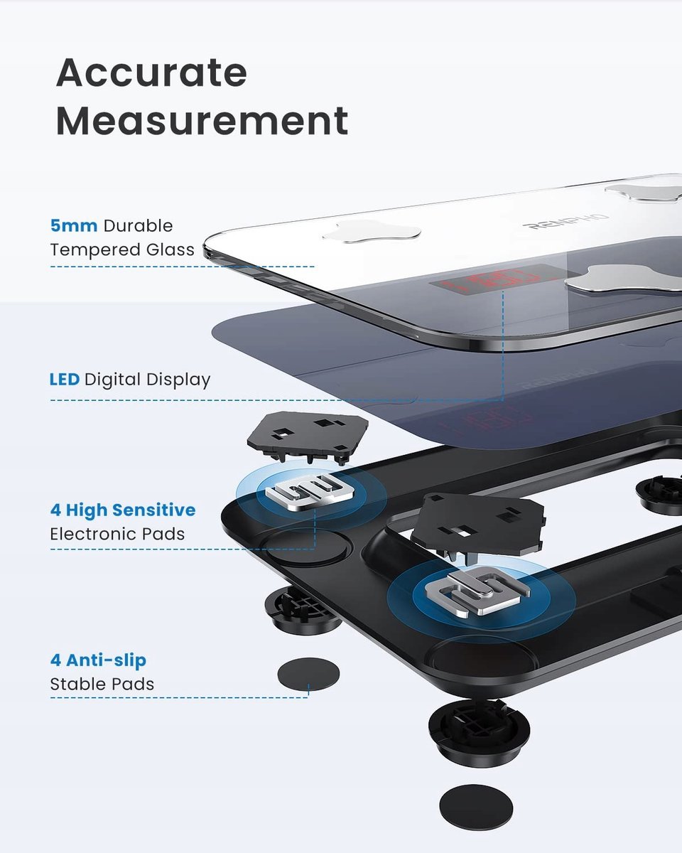 Skala o wysokiej dokładności - Inteligentna waga do pomiaru tkanki tłuszczowej jest wyposażona w 4 automatycznie kalibrujące się czujniki w kształcie litery G, które dostarczają wyniki z dokładnością do 0,1 funta / 0,05 kg przy maksymalnym udźwigu 396 funtów / 180 kg.