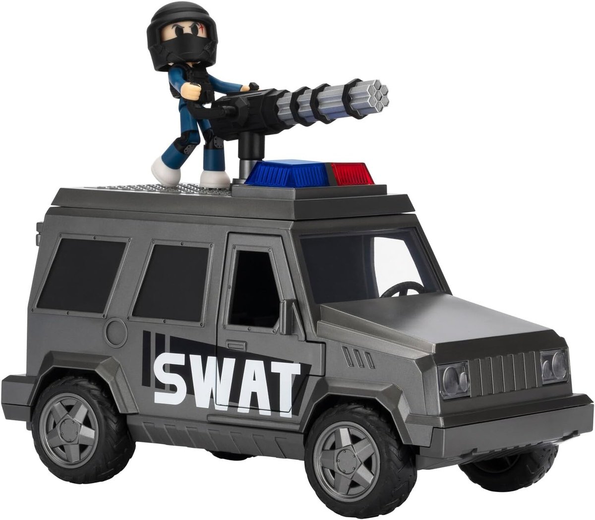 DevSeries Jailbreak: Furgonetka SWAT – pojazd 20 cm ze światłami, ruchomymi gąsienicami, zamontowanym karabinem maszynowym, figurką 7 cm i ekskluzywnym kodem na przedmiot wirtualny