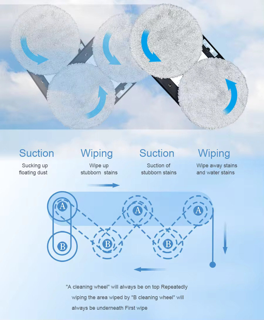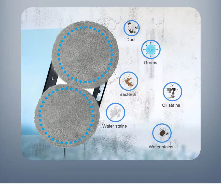 Pierścienie czyszczące z nakładkami z mikrofibry z mikro-komputerowym systemem napędowym i ultra mocnym systemem próżniowej adsorpcji wyczyszczą każde gładkie i przeźroczyste szkło bez jego uszkodzenia!