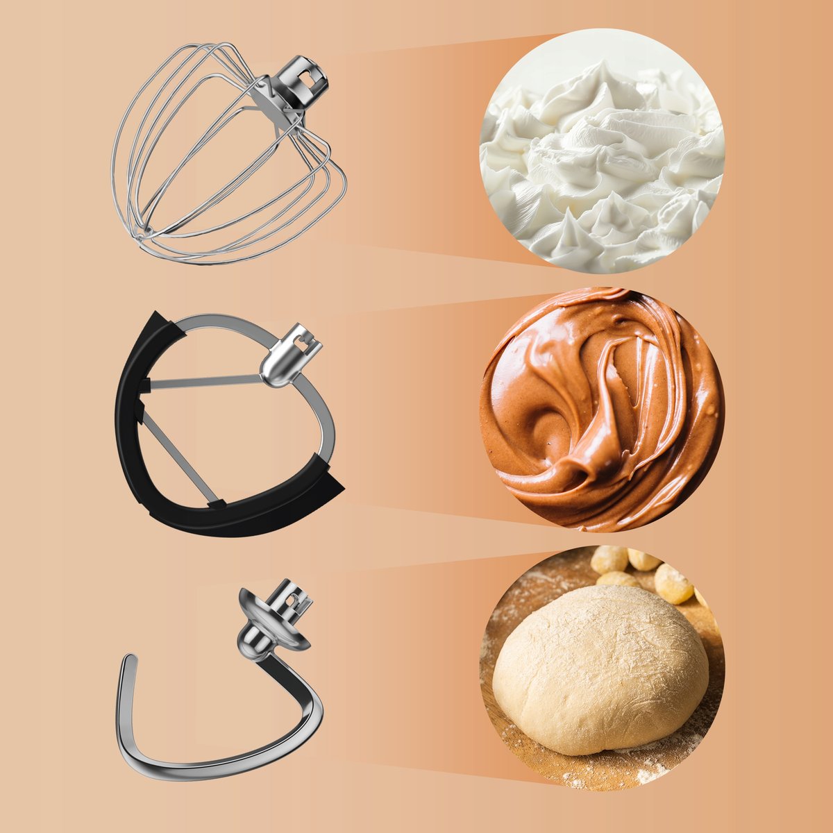 ✅ Uniwersalność działania – miesza, wyrabia i ubija różnorodne składniki — od delikatnych kremów po ciężkie ciasta drożdżowe i chlebowe.