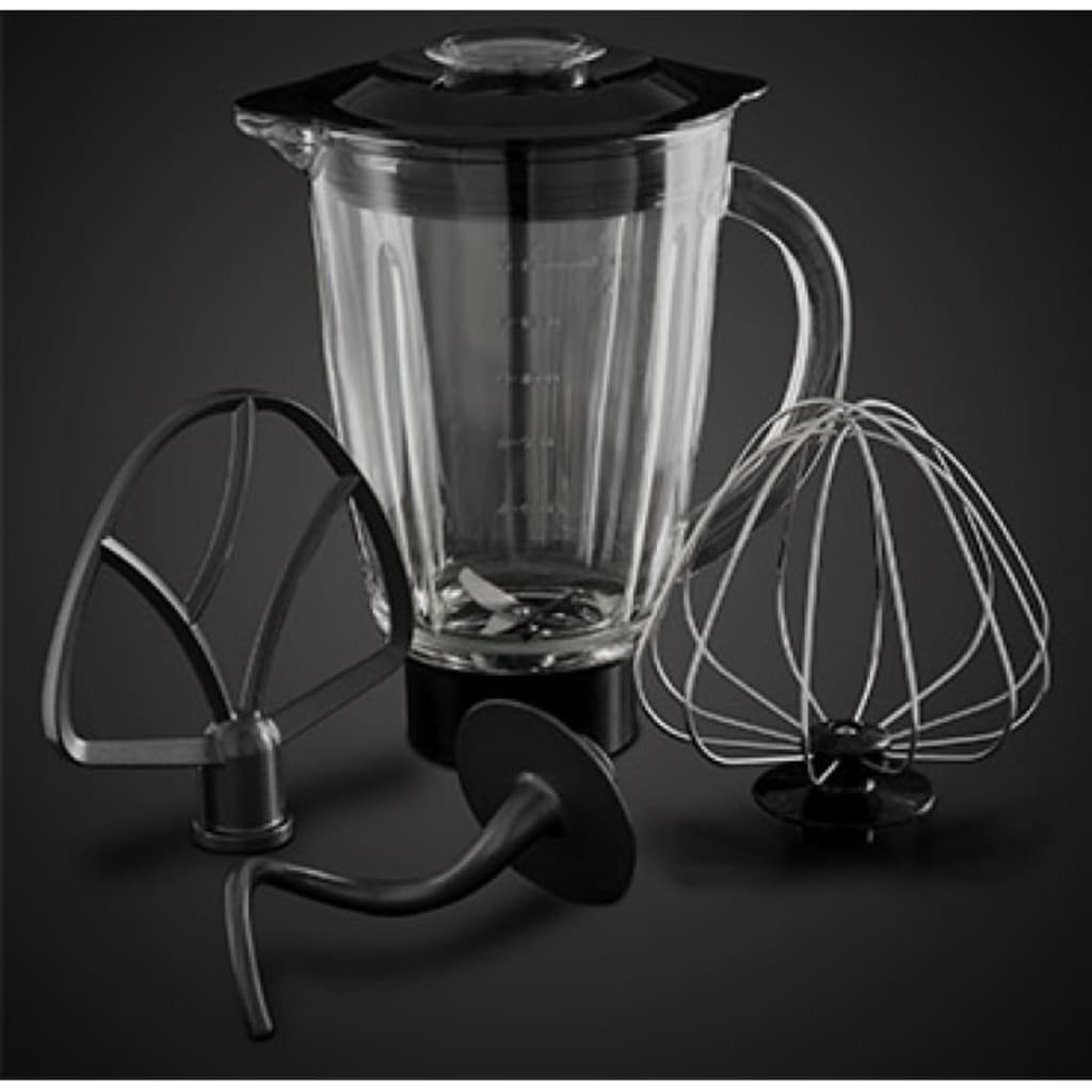 | Wyposażenie: | hak do wyrabiania ciasta, mieszadło, trzepaczka, kielich blendera, osłona przeciwbryzgowa z otworem, misa |