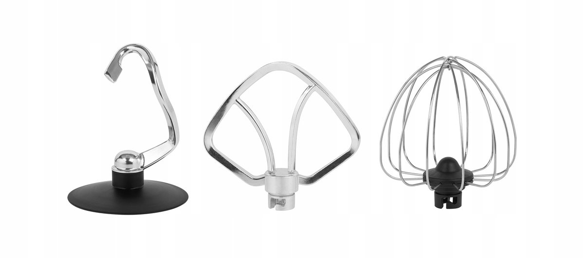| Wyposażenie: | hak do wyrabiania ciasta, mieszadło, trzepaczka, osłona przeciwbryzgowa, misa |