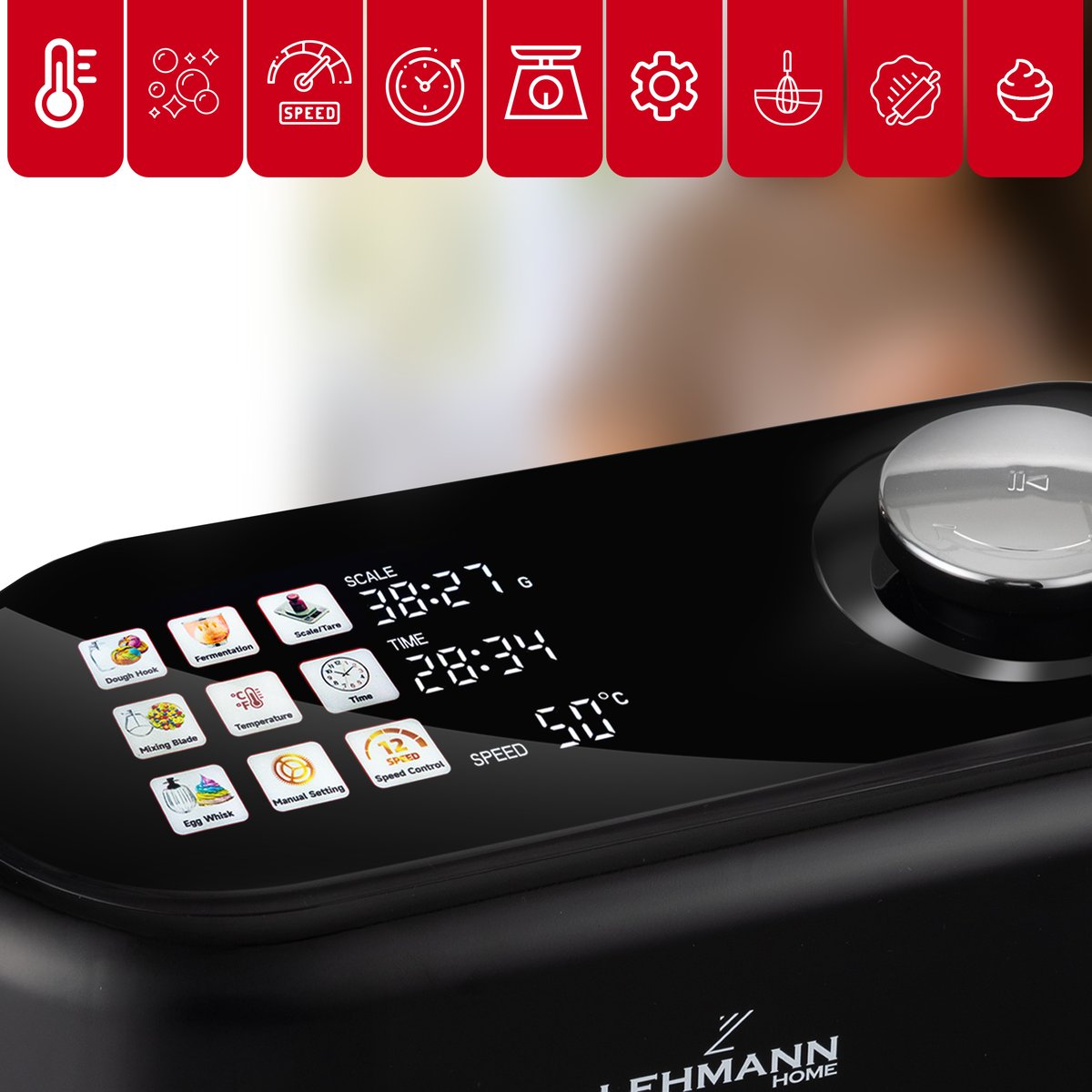 Umożliwia intuicyjne monitorowanie i kontrolę pracy urządzenia. Pokazuje m.in. aktualną prędkość mieszania, czas działania, wybrany program czy wagę składników. Dzięki niemu ustawianie parametrów staje się szybkie i wygodne, a cały proces przygotowywania potraw – jeszcze bardziej precyzyjny i komfortowy.