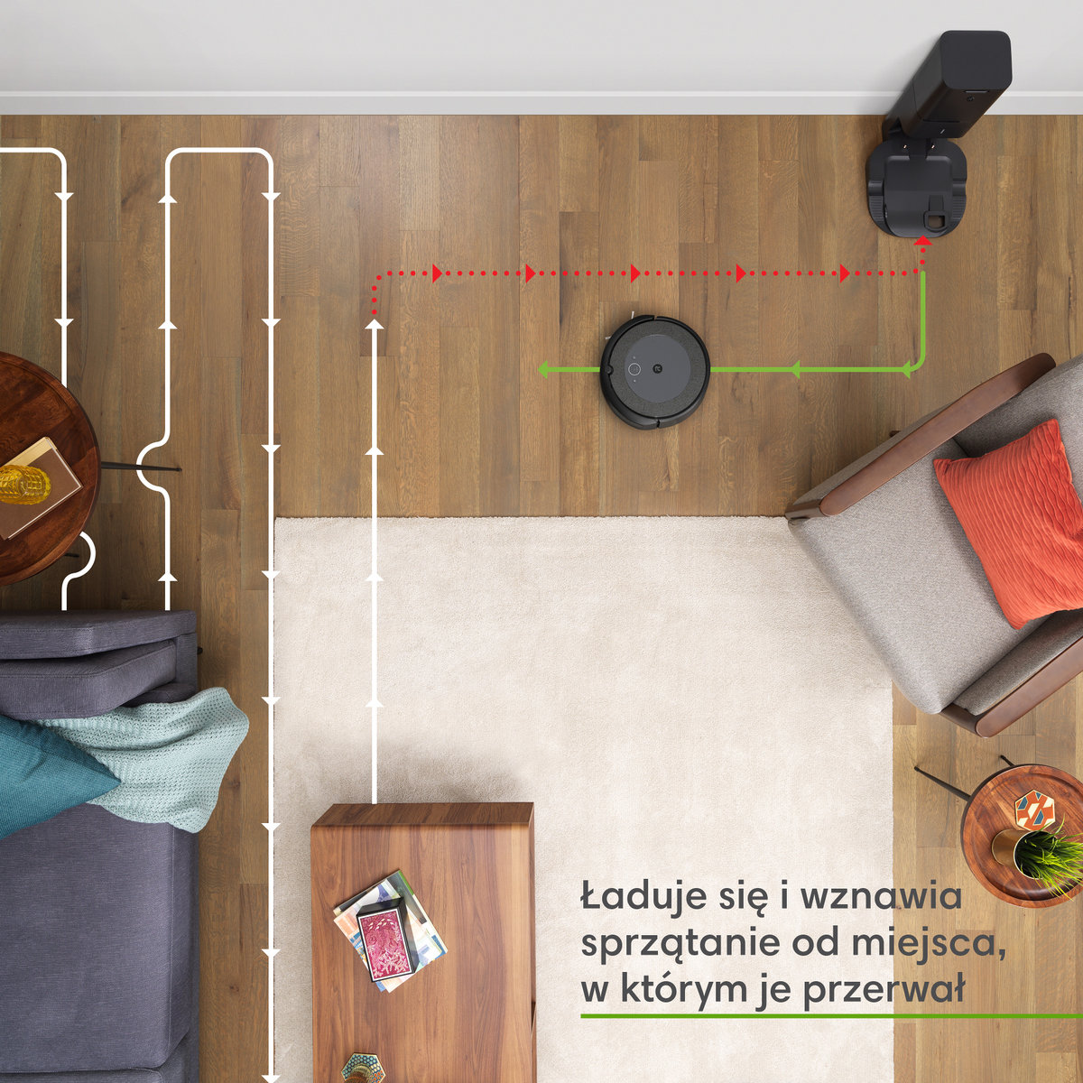 Robot odkurzający Roomba® i3+ zawsze wykonuje swoje zadanie do końca. Gdy jego akumulator jest bliski rozładowania, wraca do stacji dokującej w celu naładowania, po czym wznawia pracę w miejscu, w którym ją przerwał.