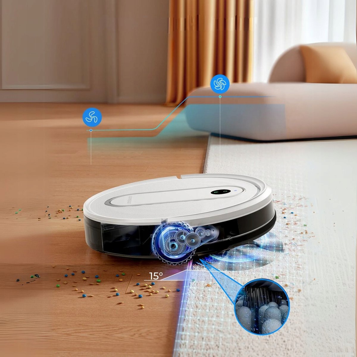 zaledwie 7,8 cm wysokości pozwala mu sprzątać pod meblami, a poziom hałasu 40 dB czyni go niemal niesłyszalnym.