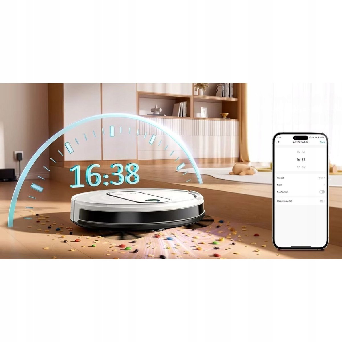Aplikacja (działa na WiFi 2.4 GHz) umożliwia zdalne sterowanie robotem, planowanie harmonogramu sprzątania, regulację siły ssania i poziomu wody. Kompatybilna z Alexa i Google Home.