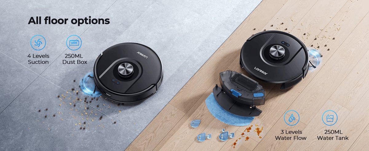 Poznaj inteligentnego robota sprzątającego Laresar 01 – kompaktowe urządzenie, które kompleksowo zadba o czystość Twojego domu. Oferuje zaawansowaną nawigację LDS, ogromną siłę ssania aż 5000Pa, możliwość mopowania oraz aż 180 minut pracy na jednym ładowaniu.
