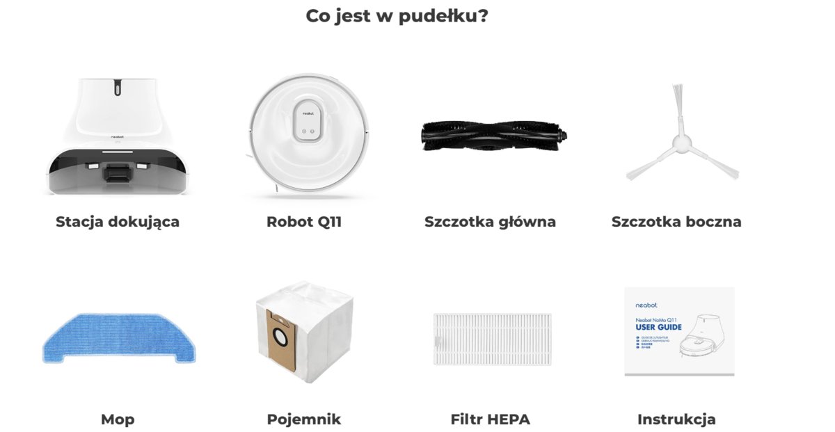| Wyposażenie: | stacja dokująca, nakładka mopująca, szczotka główna, szczotka boczna, pojemnik, filtr HEPA, instrukcja |