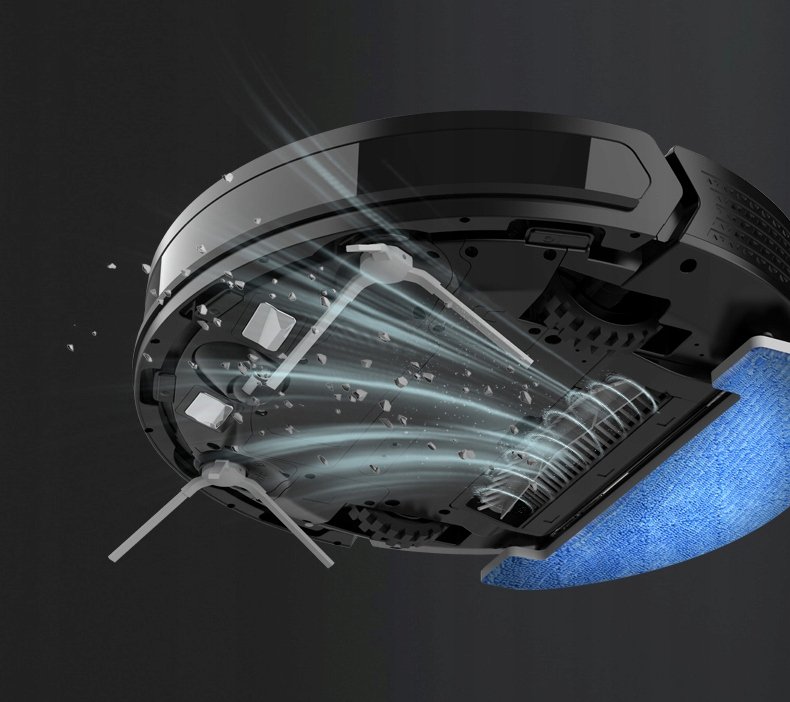 Ten odkurzacz samojezdny wyposażony został w jeden zbiornik, który zarówno zbiera zanieczyszczenia, jak i mopuje. Obie te czynności robi w tym samym czasie. Nie ma już więc potrzeby uruchamiania dwukrotnie robota do dokładnego posprzątania podłóg. Pojemność zbiornika na zanieczyszczenia wynosi 400 ml, a na wodę 250 ml.