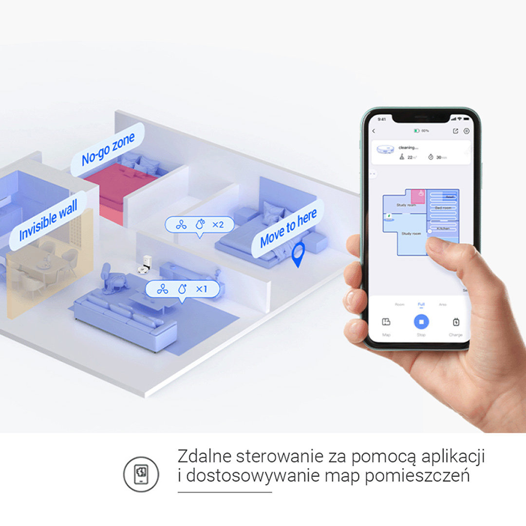 Oprócz szybkiego mapowania domu, RE5 inteligentnie dostosowuje się do codziennych zmian, zapewniając właściwe procedury sprzątania w każdym otoczeniu. Dzięki aplikacji EZVIZ można łatwo dostosować mapę piętra domu w zależności od rodzaju przestrzeni i pomieszczenia, bądź tworzyć misje sprzątania całego domu.
