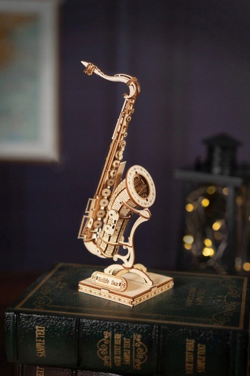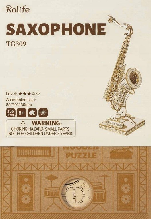 Drewniane puzzle 3D w kształcie saksofonu. Zestaw został wykonany z wysokiej jakości sklejki i jest w postaci arkuszy z wstępnie wyciętymi i ponumerowanymi elementami, które przed montażem należy oddzielić od wykroju, a następnie połączyć bez użycia klej, zgodnie ze szczegółową instrukcją dołączoną do opakowania. Dzięki wykorzystaniu nowoczesnej technologii obróbki drewna, model charakteryzuje duża ilość detali, a jego budowa jest ciekawym doświadczeniem (montaż wybranych elementów może wymagać użycia kleju do drewna- zestaw nie zawiera kleju).