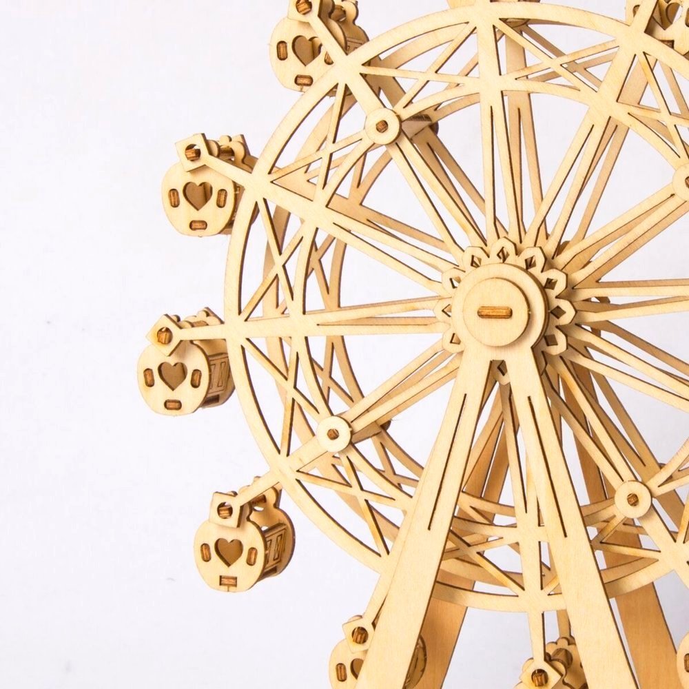 Drewniane puzzle 3D w kształcie karuzeli diabelski młyn. Zestaw został wykonany z wysokiej jakości sklejki i jest w postaci arkuszy z wstępnie wyciętymi i ponumerowanymi elementami, które przed montażem należy oddzielić od wykroju, a następnie połączyć bez użycia klej, zgodnie ze szczegółową instrukcją dołączoną do opakowania. Dzięki wykorzystaniu nowoczesnej technologii obróbki drewna, model charakteryzuje duża ilość detali, a jego budowa jest ciekawym doświadczeniem (montaż wybranych elementów może wymagać użycia kleju do drewna- zestaw nie zawiera kleju).