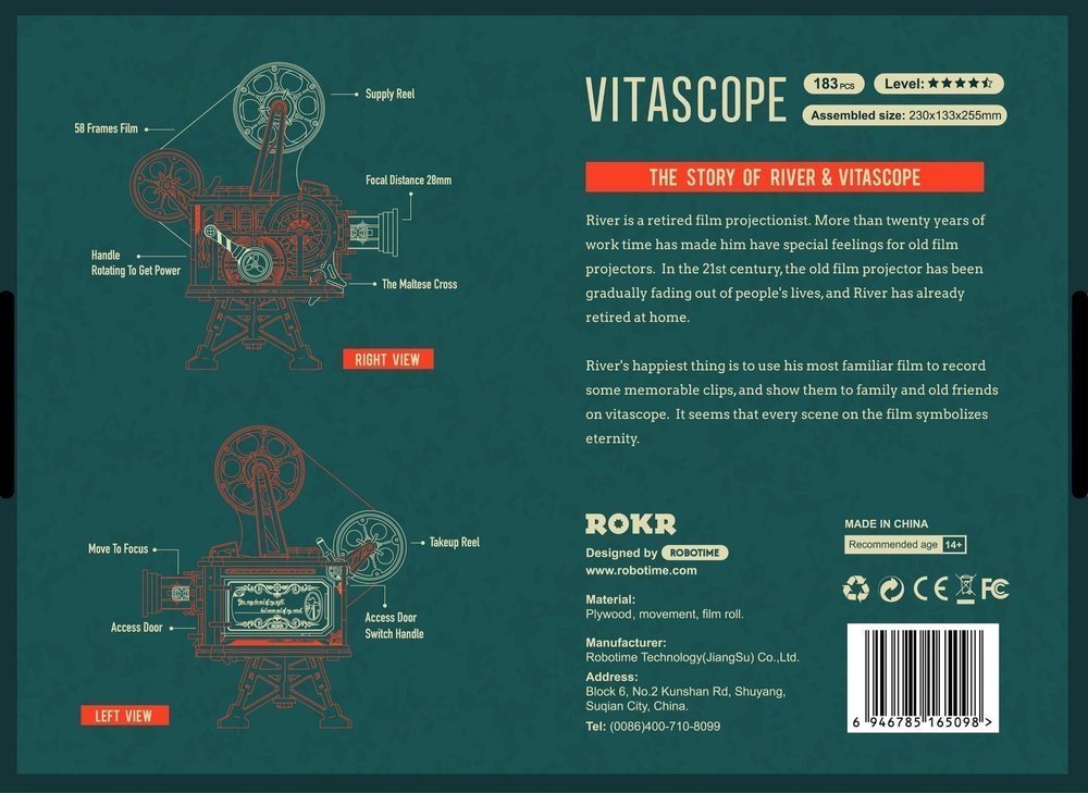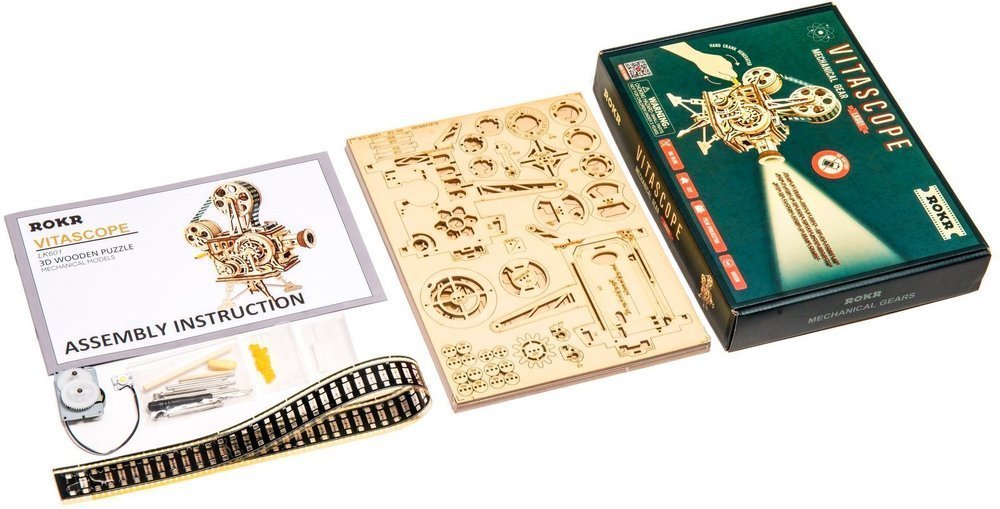 Zestaw do budowy drewnianego projektora filmowego w stylu retro. Model posiada mechanizm korbowy umożliwiający odtwarzanie taśmy filmowej. Projektor został wykonany z wysokiej jakości sklejki i jest w postaci arkuszy z wstępnie wyciętymi i ponumerowanymi elementami, które przed montażem należy oddzielić od wykroju, a następnie połączyć bez użycia kleju, zgodnie ze szczegółową instrukcją dołączoną do opakowania. Dzięki zastosowaniu nowoczesnej technologii obróbki drewna, model charakteryzuje oryginalna konstrukcja, a jego budowa będzie ciekawym doświadczeniem. W komplecie fragment filmu z udziałem Charliego Chaplina.