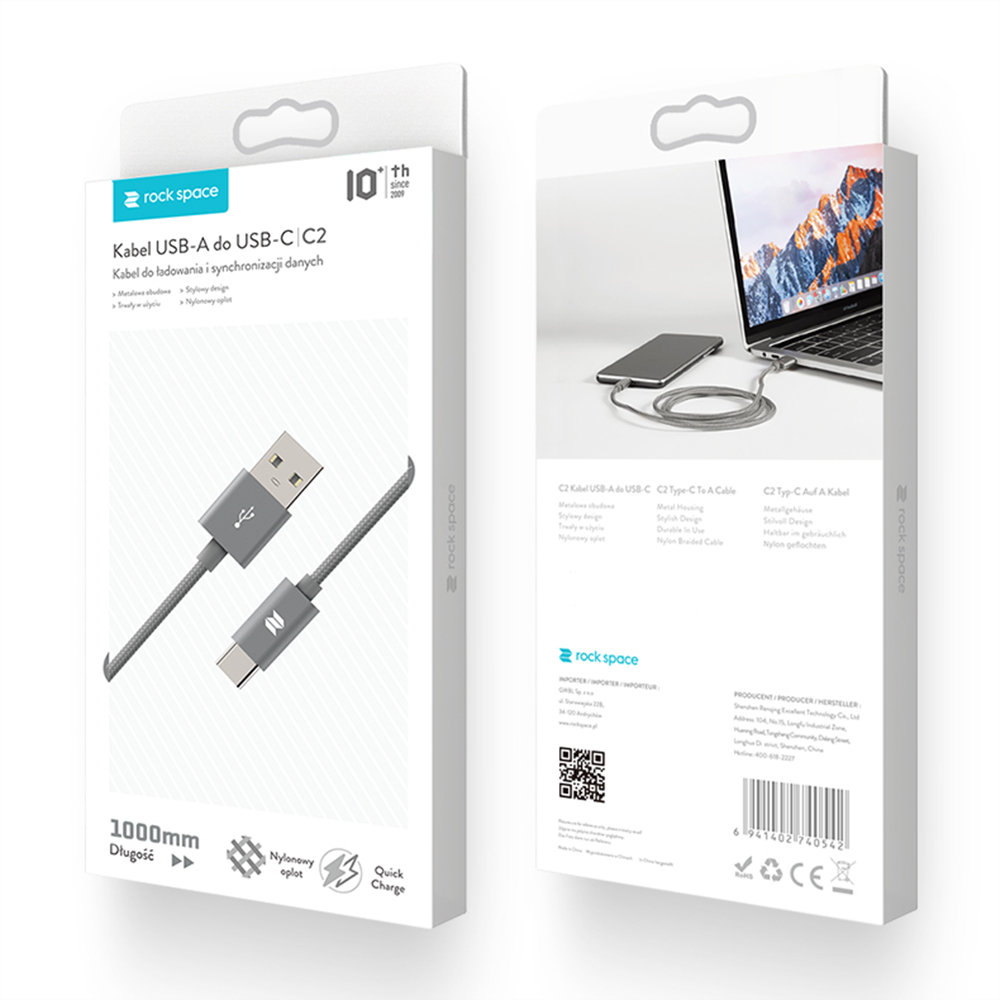 Nylonowy Kabel ROCK SPACE USB-C to wytrzymały kabel z nylonowym oplotem, w którym zakończenia wtyków zostały zaprojektowane w taki sposób, aby przetrwały długie i intensywne użytkowanie. Kabel obsługuje ładowanie do 2A mocy. Podniesiona została również wytrzymałość wtyków - przeszły test 10 tys podłączeń oraz zostały one specjalnie wyprofilowane, tak aby możliwe było użytkowanie kabla nawet w przypadku, kiedy Twój telefon znajduje się w etui. Kabel posiada funkcję ładowania oraz przesyłania danych. Kabel o długości 100 cm.