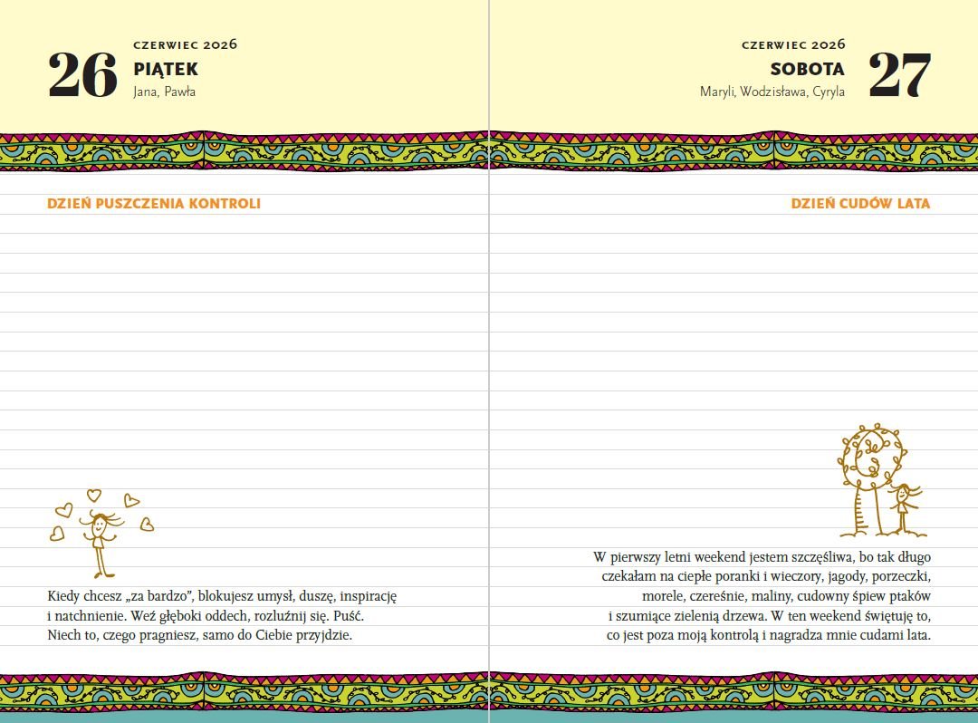 Motywacyjny, inspirujący poradnik na każdy dzień roku. 365 tekstów wraz z autorskimi rysunkami, przepisami kulinarnymi i żółtymi kartkami. Otwórz się na nowe możliwości, nowy początek i nowe życie. Oprawa twarda wypełniona pianką z zaokrąglonymi rogami, kolorowe rysunki i zdjęcia, linki multimedialne.