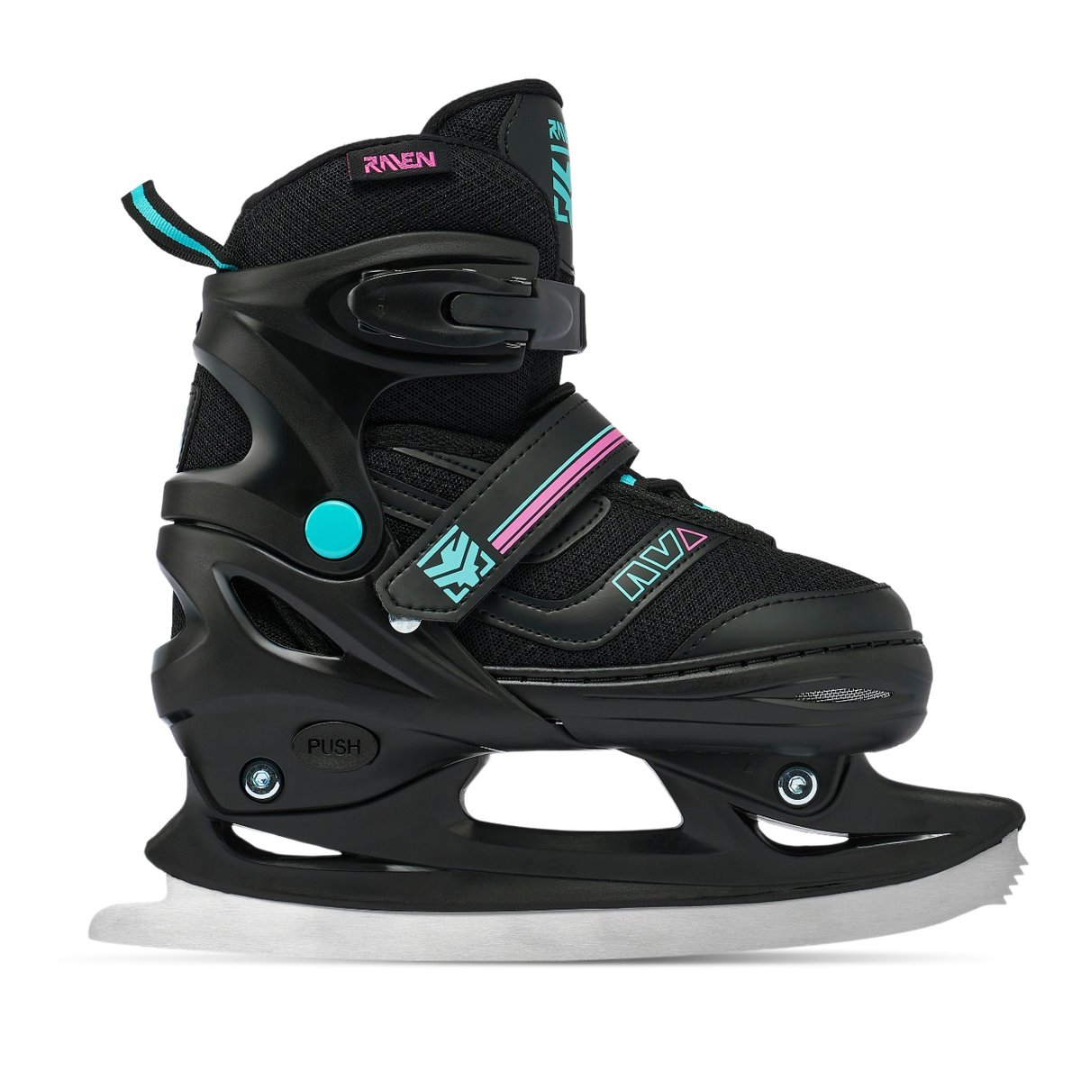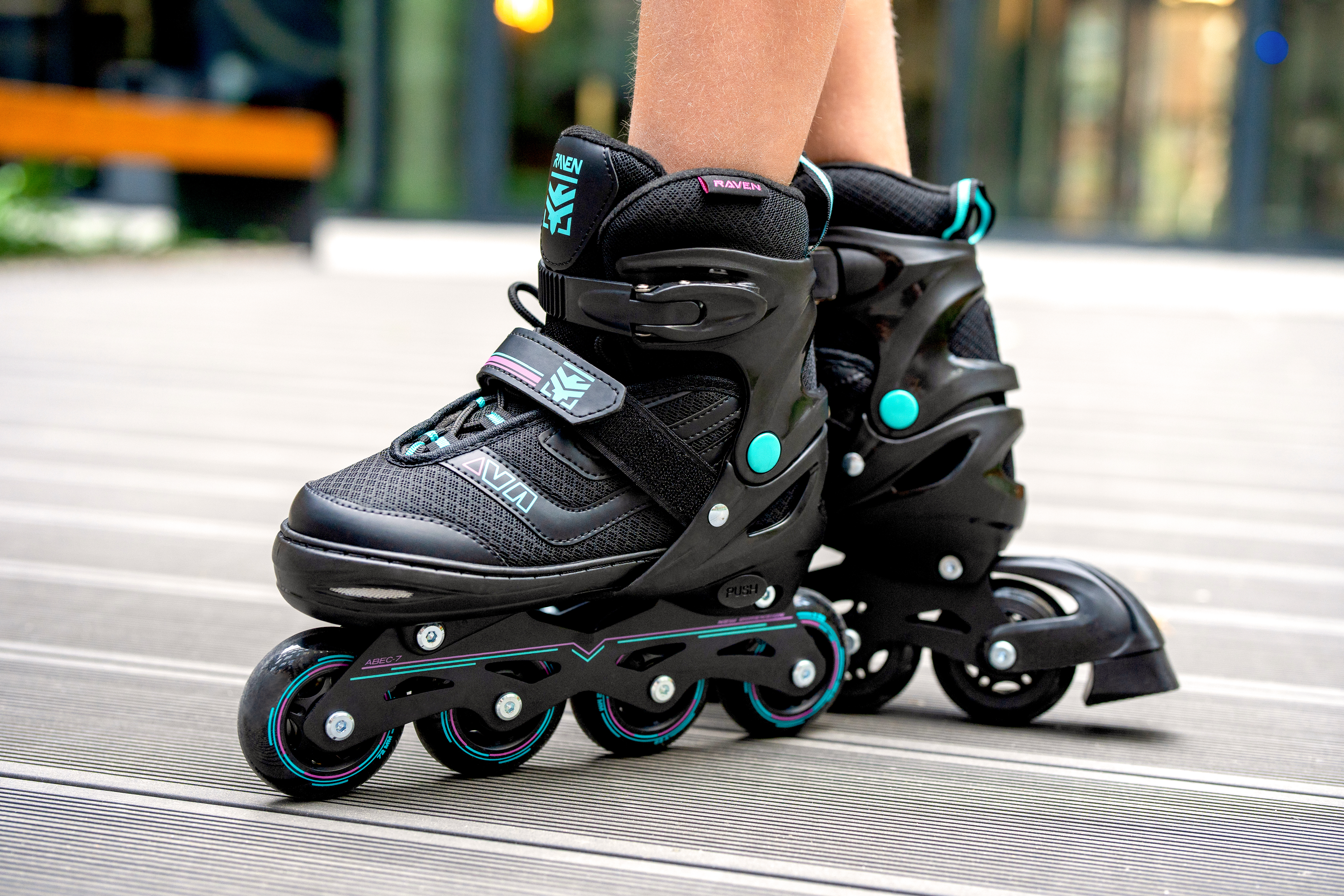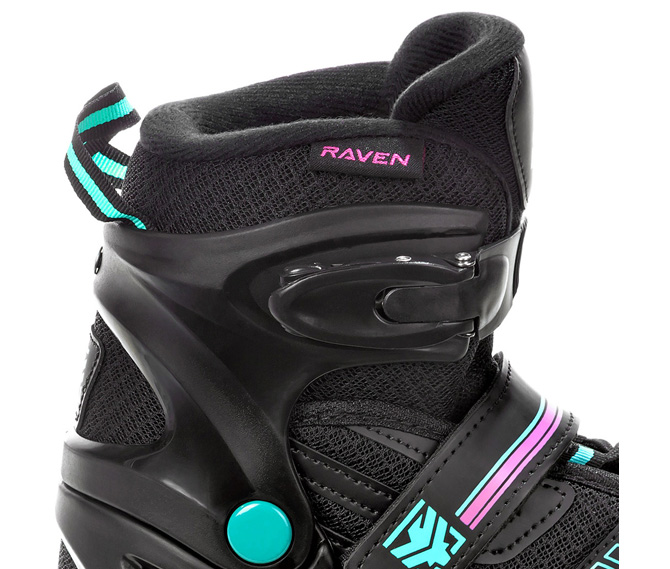 Sznurowadła, klamra z paskiem zębatym oraz zatrzask zapewniają odpowiednie ściągnięcie i pewne trzymanie stopy w bucie, zapobiegają przemieszczaniu się stopy i gwarantują bezpieczną jazdę. Zatrzaski w rolkach Raven posiadają przycisk, który zapobiega ich rozpinaniu podczas jazdy. Pasek na rzep pozwala przytrzymać sznurowadła, powstrzymując je przed przypadkowym rozwiązaniem.