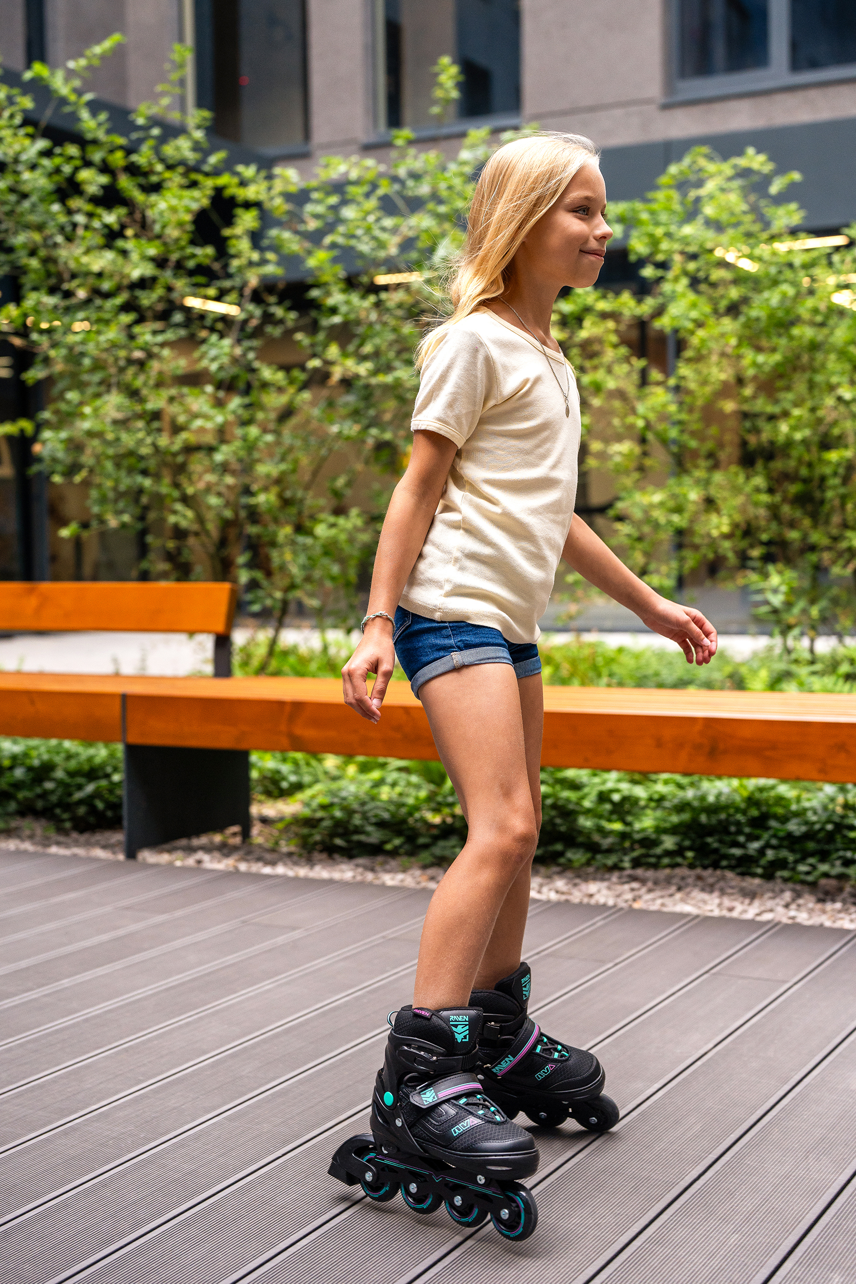 Do zmiany rozmiaru niepotrzebne są żadne narzędzia. Wystarczy nacisnąć przycisk i rozsunąć przednią skorupę buta. Dzięki temu rolki posłużą na wiele sezonów i zawsze będą dobrze dopasowane do rozmiaru stopy.