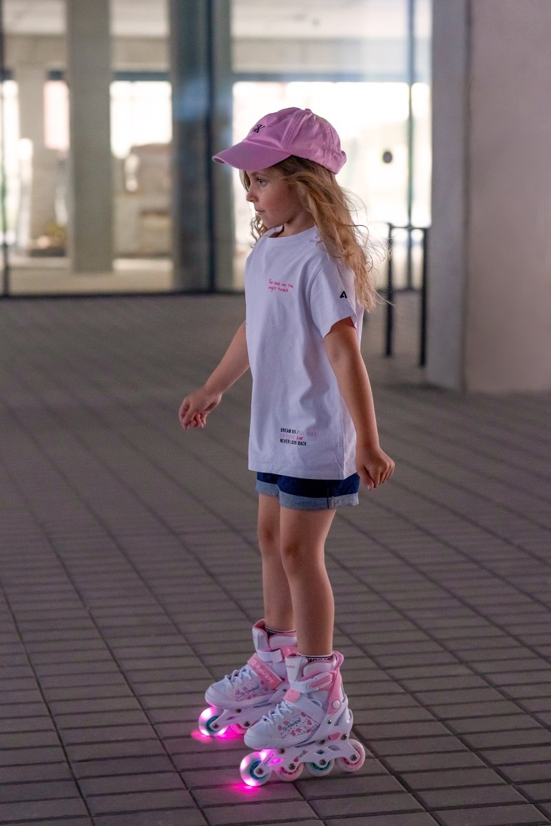Rolki wyposażone zostały w dwa kółka LED, które świecą poprzez wprowadzenie ich w ruch.