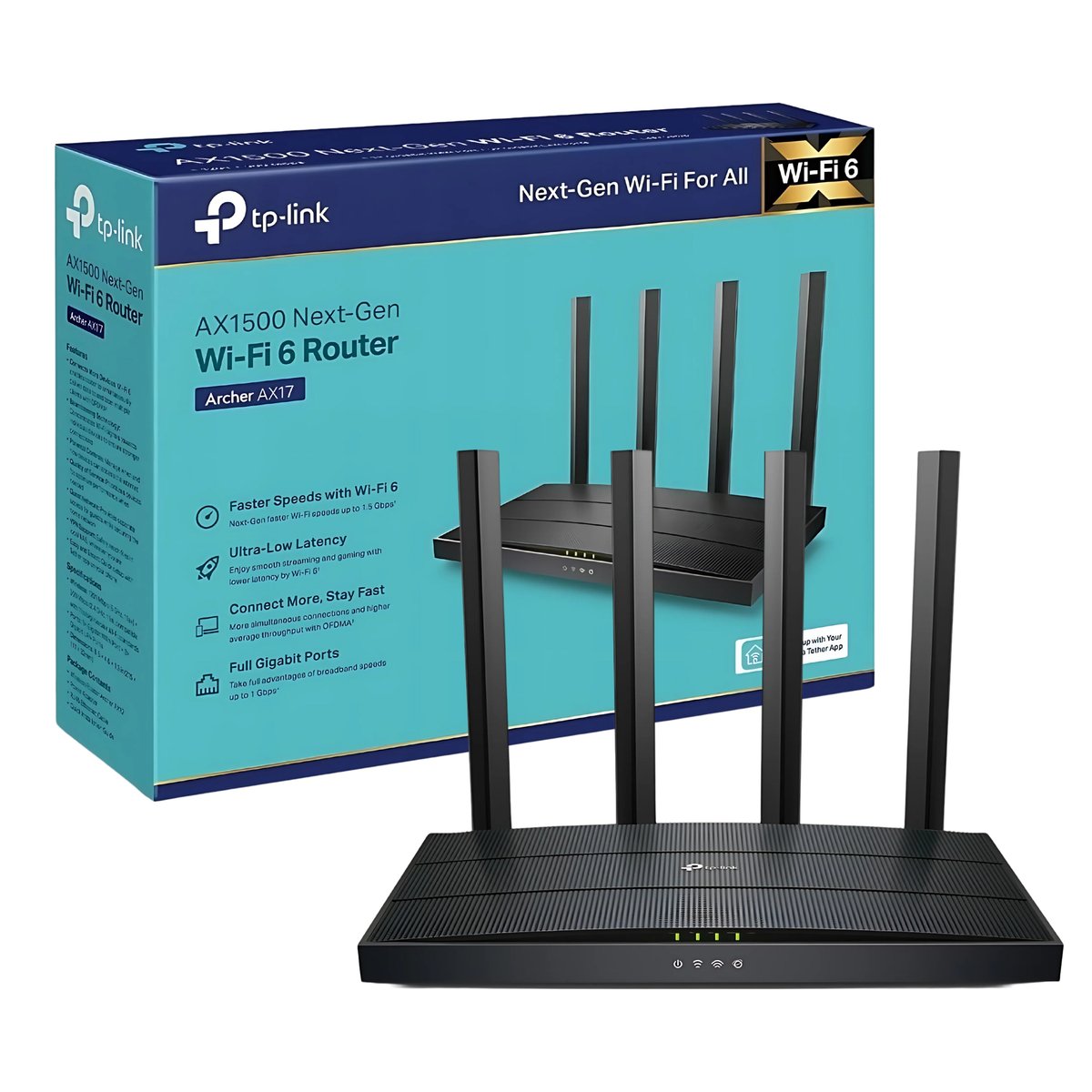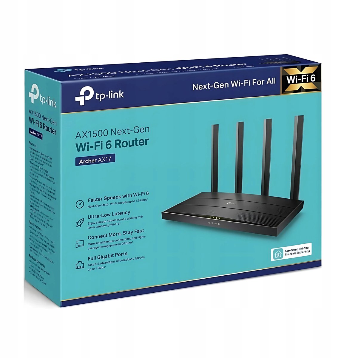 ► Router TP-Link Archer AX17 wykorzystuje najnowszą technologię Wi-Fi 6, zapewniając szybkie i stabilne połączenie bezprzewodowe o maksymalnej prędkości 1,5 Gb/s (1201 Mb/s w paśmie 5 GHz oraz 300 Mb/s w paśmie 2,4 GHz).