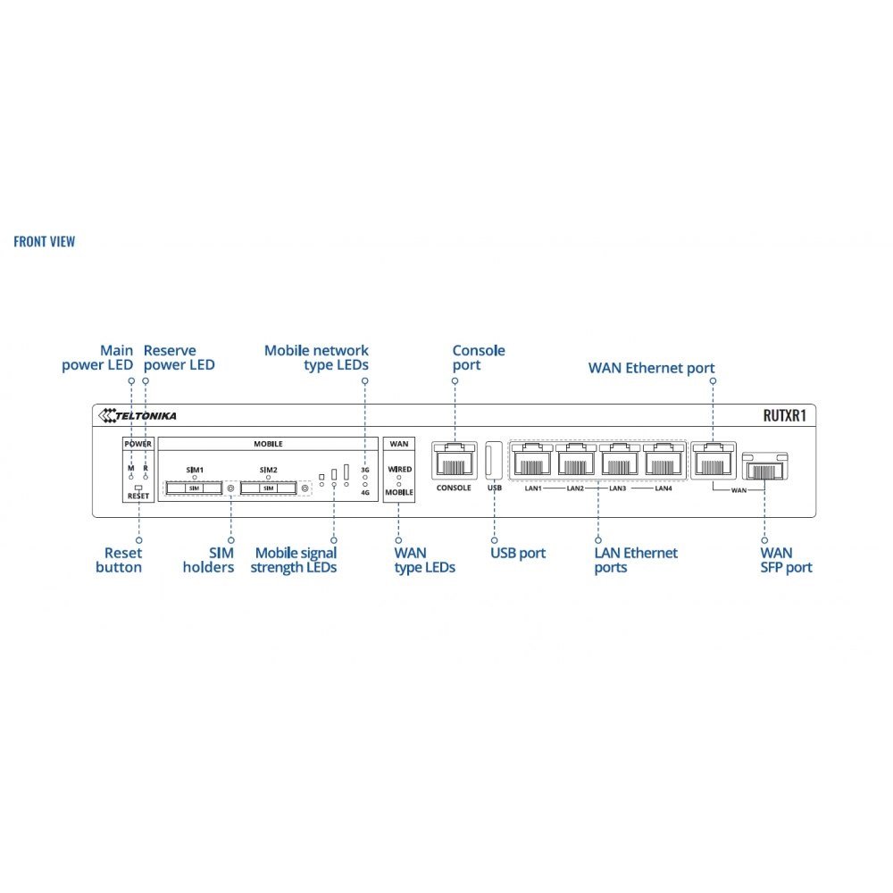 Router Teltonika RUTXR1 – router Dual-SIM 4G/LTE Cat6, Wi-Fi DualBand, 4x Gigabit LAN, 1x Gigabit WAN, 1x SFP, 1x USB, 1x port konsoli RJ45 RS-232, 2x zasilanie, przystosowany do montażu w szafach Rack 19", RMS