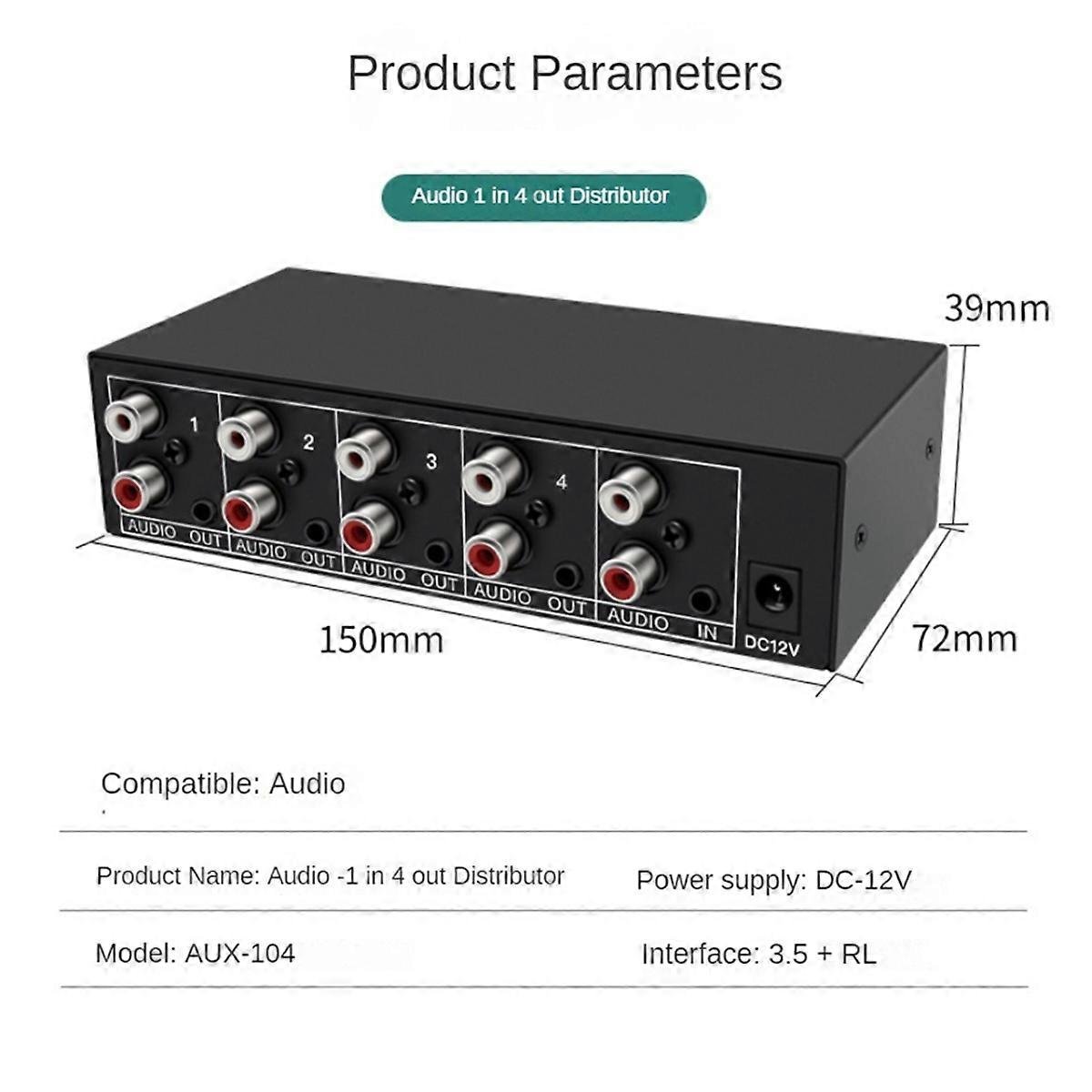 Cechy: Wysyła dźwięk do wielu urządzeń jednocześnie Umożliwia podłączenie do 4 urządzeń Instalacja trwa kilka sekund i nie wymaga oprogramowania Zasilanie 12 V DC zapewnia niezawodność Dystrybutor dźwięku stereo 1x4 działa jako rozdzielacz w zastosowaniach dźwięku stereo, zapewniając (4) wyjścia dźwięku stereo identyczne z sygnałem źródłowym dźwięku. Jest w stanie rozdzielić sygnał dźwięku stereo z (1) źródła na (4) urządzenia ze zgodnymi wejściami. Ten analogowy rozdzielacz dźwięku 1X4 współpracuje z dekoderami satelitarnymi i kablowymi, odtwarzaczami DVD i innymi urządzeniami, które zawierają odpowiednie połączenia audio. Typ wtyczki: wtyczka amerykańska, dotyczy Kanady, Indii, Meksyku, Tajlandii, Stanów Zjednoczonych, Filipin, Tajwanu itd. / Typ wtyczki: wtyczka UE, dotyczy Indonezji, Niemiec, Francji, Hiszpanii, Włoch itd. Napięcie: AC100-240 V Rozmiar: 150 x 72 x 39 mm Materiał: metal Kolor: czarny Zawartość opakowania: 1 x rozdzielacz dźwięku 1 x zasilacz Tylko powyższa zawartość opakowania, inne produkty nie są dołączone. Uwaga: Odbicie światła i różne wyświetlacze mogą powodować, że kolor przedmiotu na zdjęciu będzie się nieznacznie różnić od rzeczywistego. Dopuszczalny błąd pomiaru wynosi +/- 1-3 cm.
