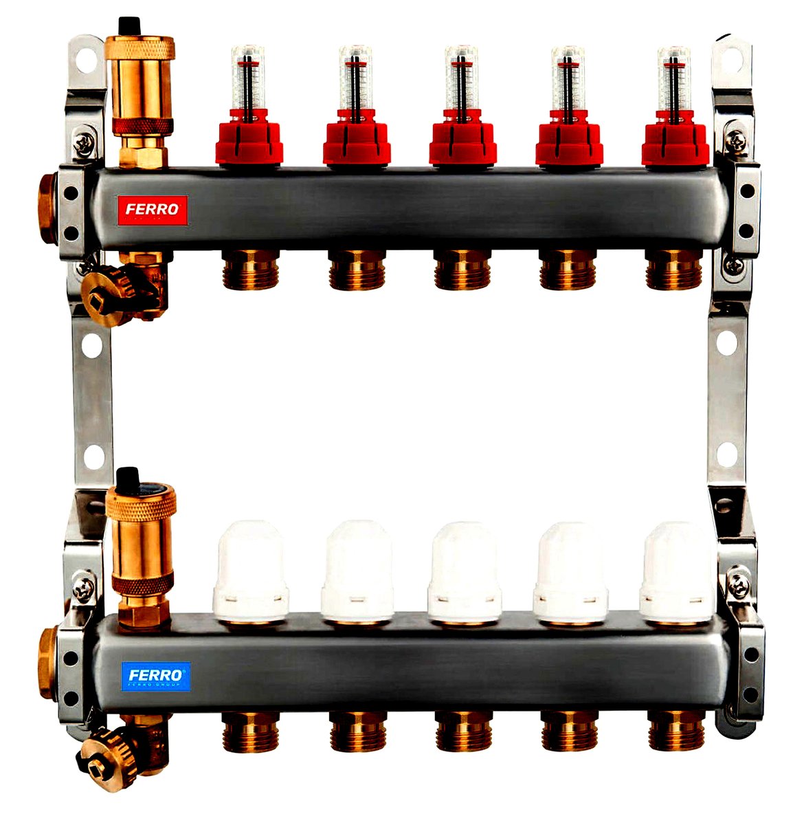 Rozdzielacz ze stali nierdzewnej 1" 12-drogowy z zaworami termostatycznymi, przepływomierzami, odpowietrznikami automatycznymi, zaworami spustowymi, nyplami 3/4" Opis produktu Rozdzielacz ze stali ...