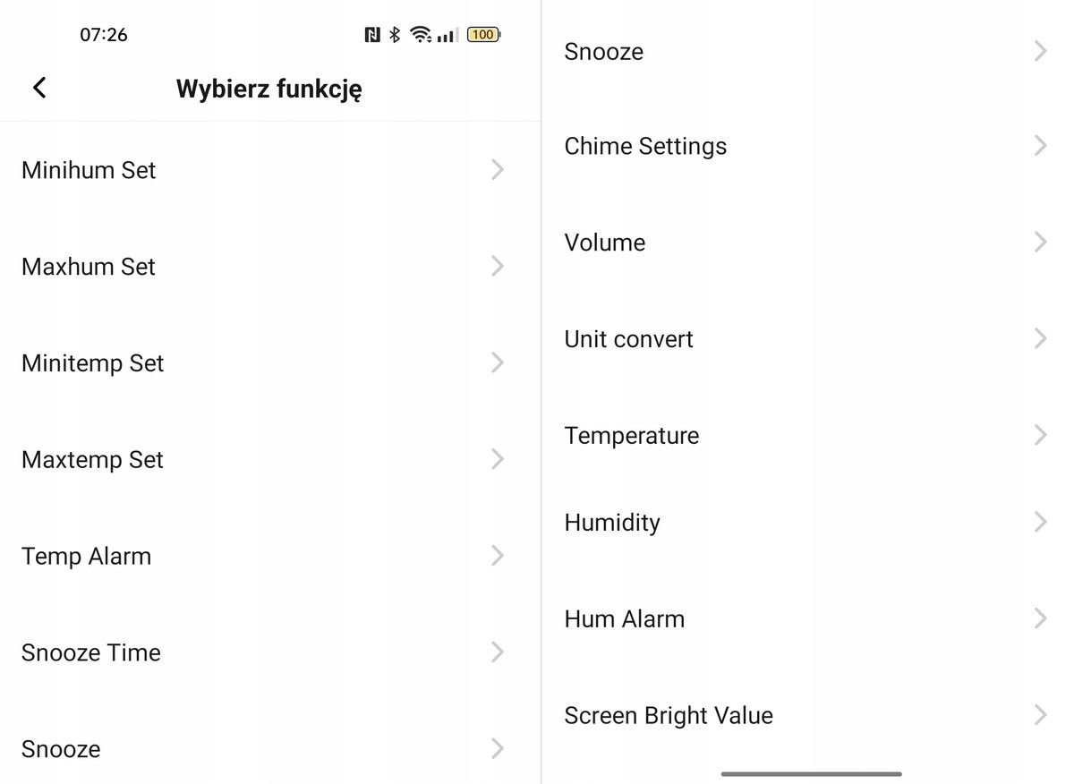 Ustawienie czasu/budzika, regulacja podświetlenie, ustawienie poziomu dźwięku budzenia, wybór melodii, parowanie/przełączanie stopni C/F