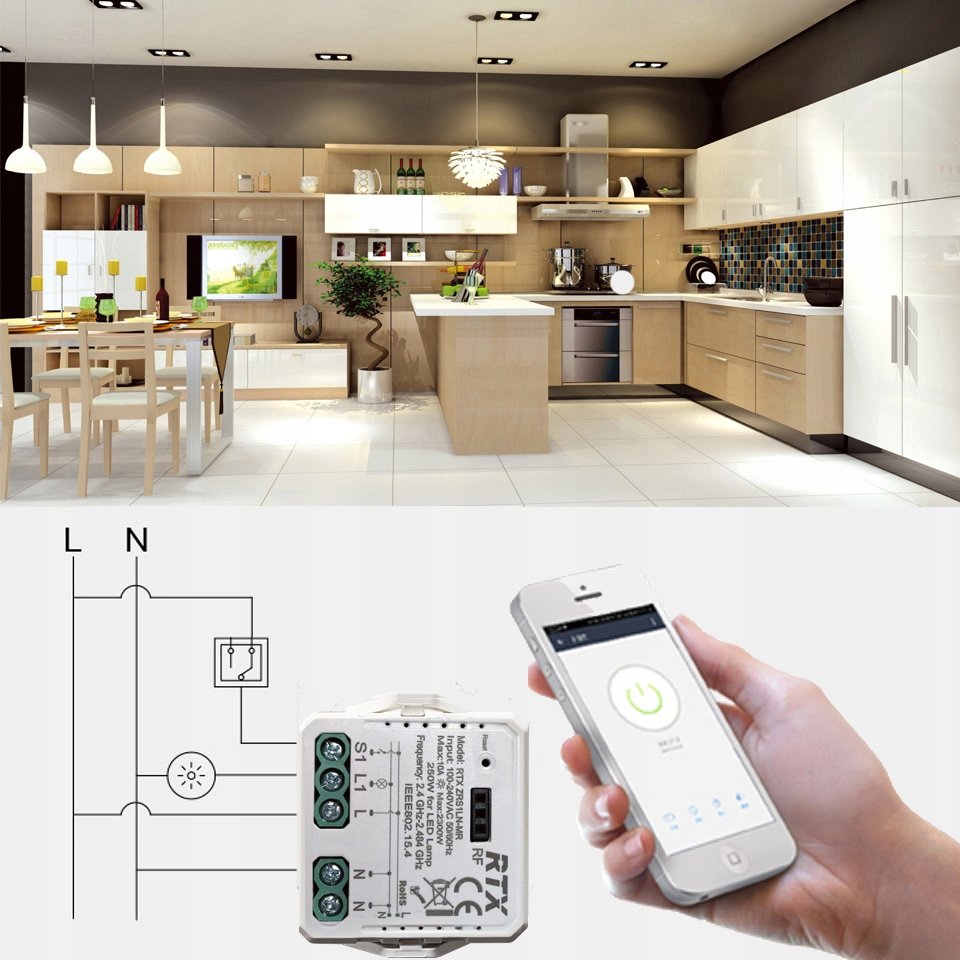 ➡️ Uniwersalny miniaturowy moduł RTX ZRS1LN-MR przeznaczony do inteligentnego za pomocą aplikacji lub lokalnie za pomocą mechanicznych włączników światła oraz opcjonalnie z pilota RF