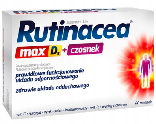 | Nazwa: | Suplement diety, Rutinacea Max D3 + Czosnek Witamina D, 60 Tab. |