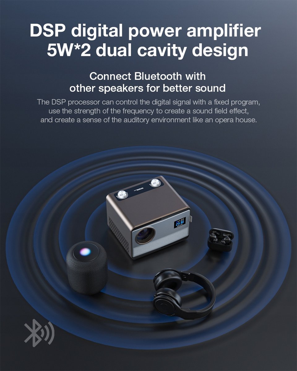 Projektor BlitzWolf BW-V7 wyposażony jest w dwa głośniki o mocy 5W każdy, które zapewniają doskonałą jakość dźwięku z głębokimi basami. Dzięki wbudowanemu cyfrowemu wzmacniaczowi mocy i możliwości połączenia przez Bluetooth, można podłączyć dodatkowe głośniki, co pozwala na jeszcze lepsze doznania dźwiękowe.
