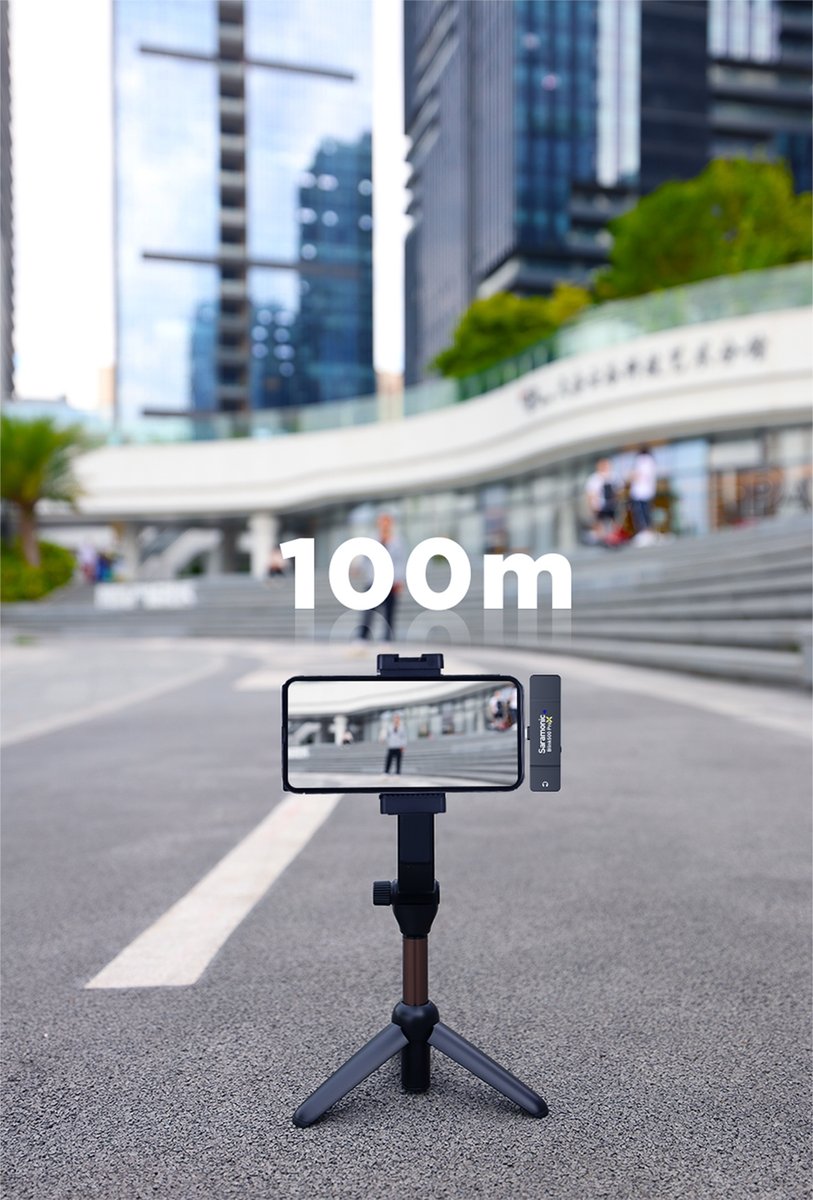 Zasięg sygnału, jaki oferuje zestaw do bezprzewodowej transmisji dźwięku Saramonic Blink500 ProX B3 (RXDi + TX) wynosi 100 metrów. Dzięki temu możesz swobodnie poruszać się z mikroportem po dużym terenie, a wysokiej jakości dźwięk zostanie zarejestrowany bez jakichkolwiek zakłóceń.