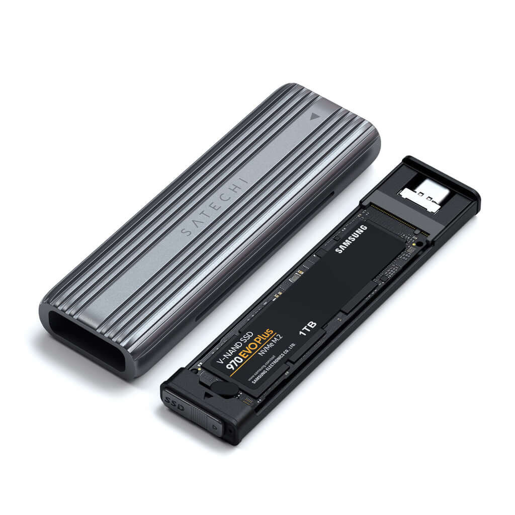 Beznarzędziowa obudowa Satechi USB-C NVMe and SATA SSD Enclosure może łatwo połączyć dyski SSD M.2 NMVe lub SSD M.2 SATA z komputerem, aby rozszerzyć pamięć masową, zaktualizować system, utworzyć kopię zapasową plików, odzyskać i odzyskać dane oraz przenieść dane. Plug and play, nie wymaga sterowników. W zestawie kabel USB 3.1 gen. 2.