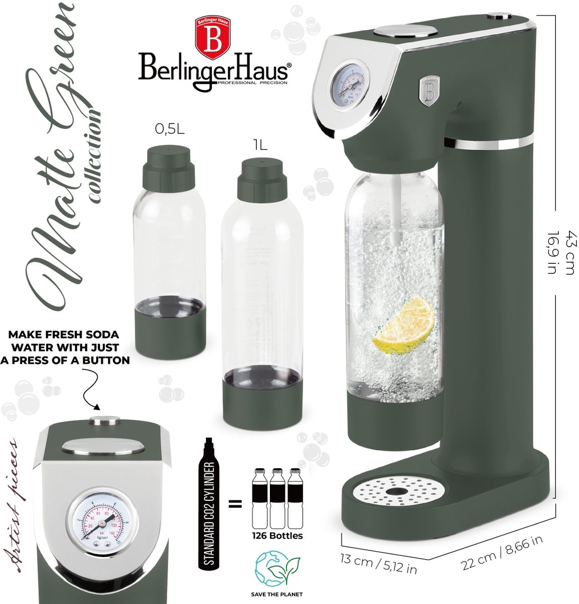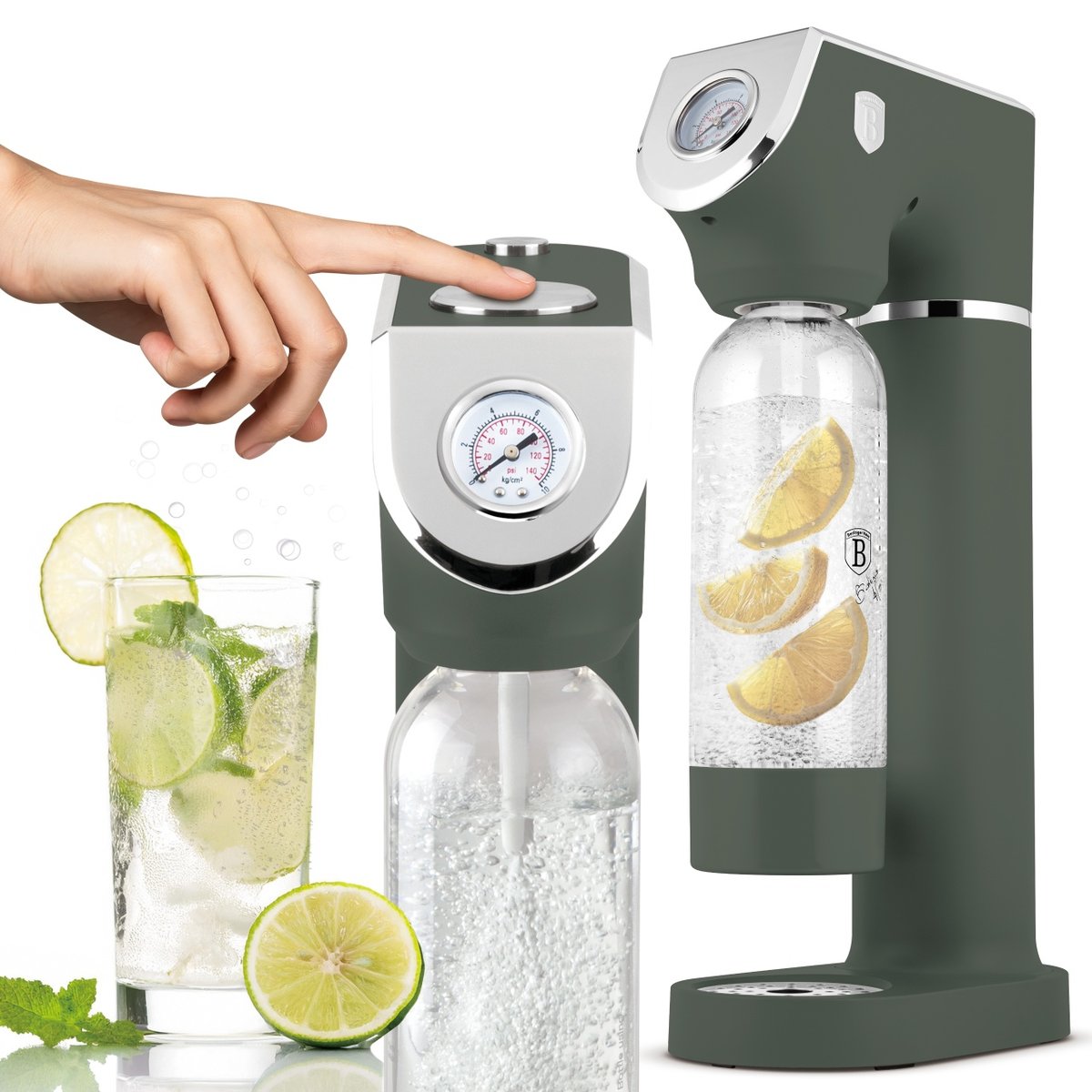 Saturator z 2 butelkami i manometrem Berlinger Haus – kolekcja Matte Green