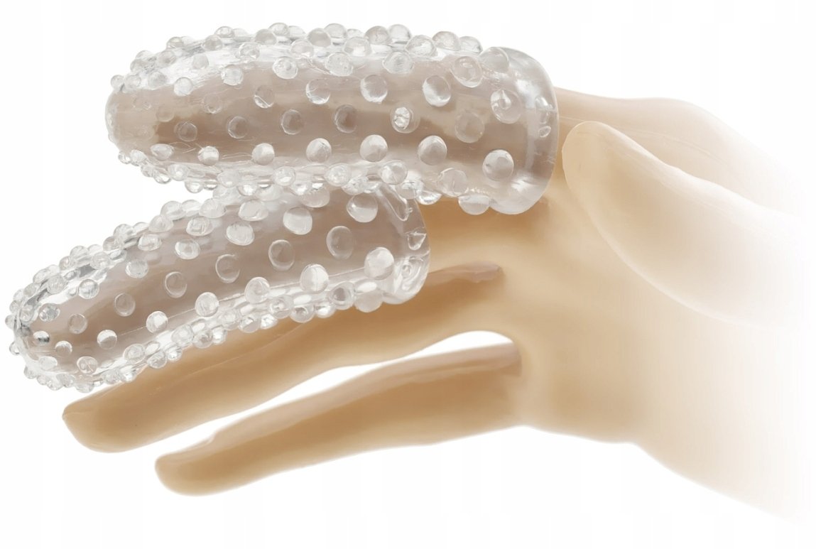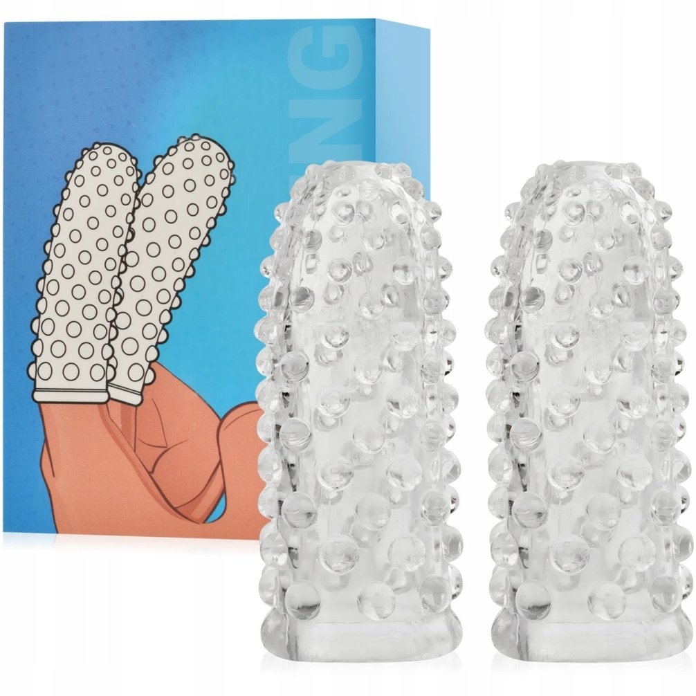Żelowe nakładki na palec ze stymulującymi wypustkami. Dwie innowacyjne nasadki o regularnie rozmieszczonych wypustkach doskonale urozmaicą petting. Nakładki nałożone na palce i pokryte lubrykantem cudownie wypieszczą łechtaczkę i wnętrze pochwy podczas palcówki, szybko doprowadzając do spazmatycznego orgazmu.